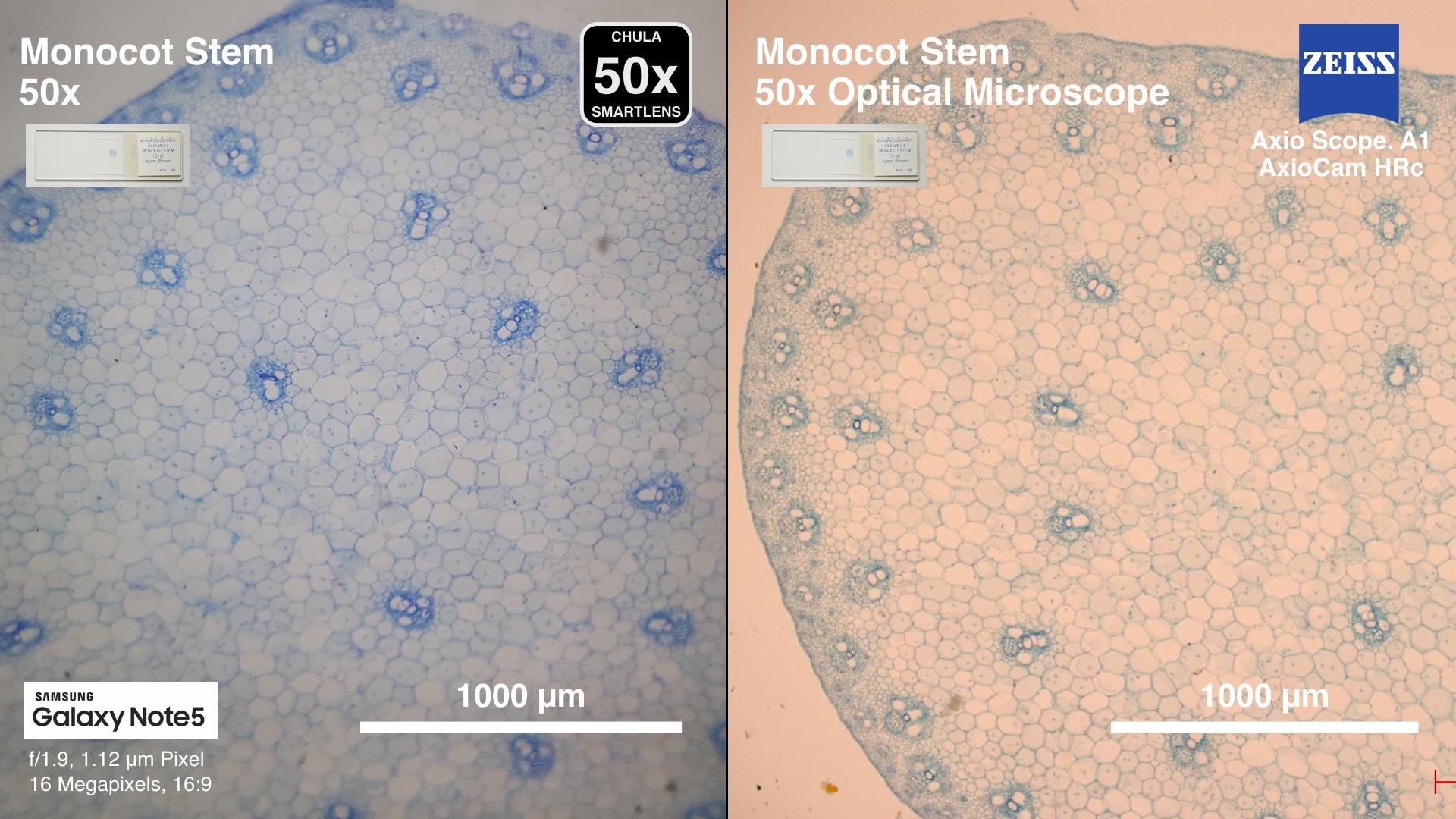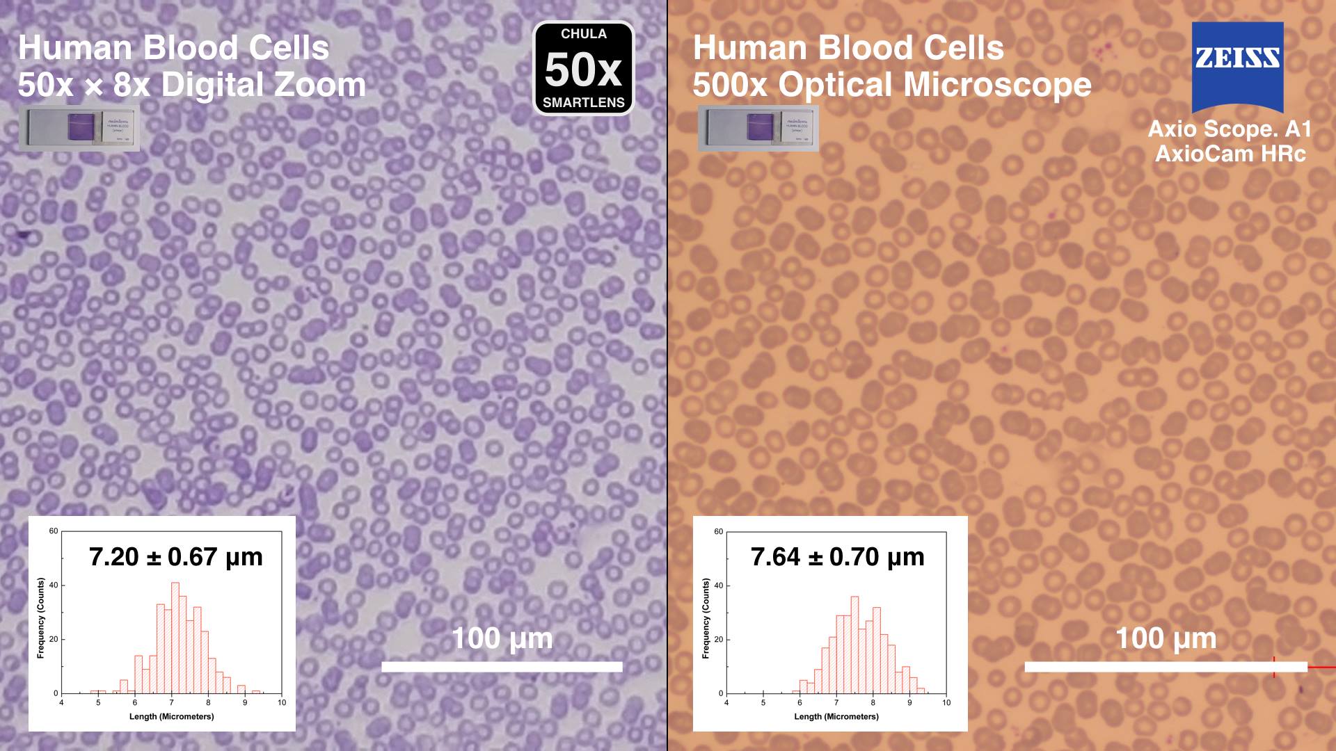 ภาพเซลล์เม็ดเลือดแดงของมนุษย์ ที่ถ่ายด้วย 50x Chula SmartLens ชัดมาก ในเชิงปริมาณ ค่าเส้นผ่านศูนย์กลางของเม็ดเลือดแดงที่วัดได้จากภาพถ่ายของ Chula SmartLens กับ กล้องจุลทรรศน์ใช้แสงปกติ ยังมีค่าใกล้เคียงกันอีกด้วย (แตกต่างกันน้อยกว่า 5%)