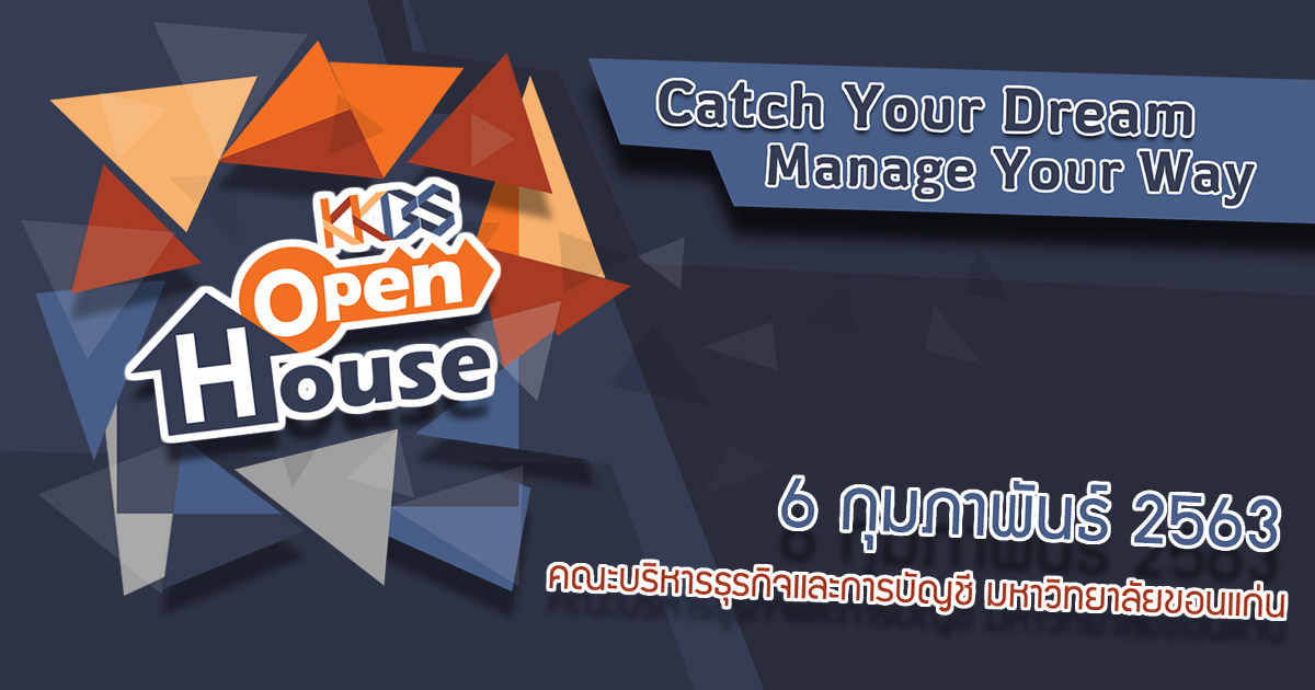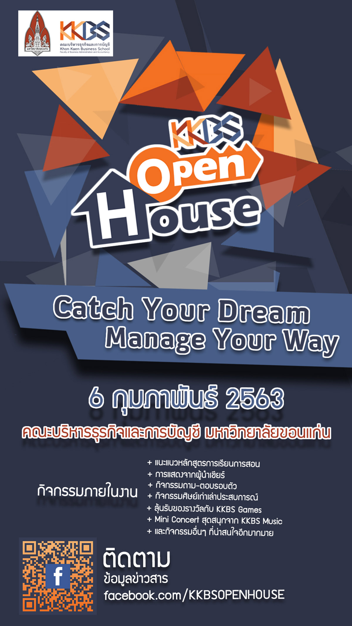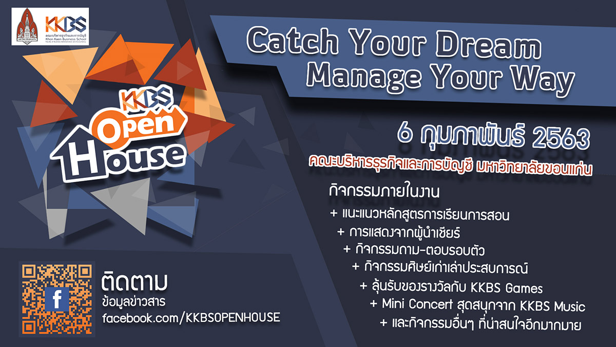 คณะบริหารธุรกิจและการบัญชี มหาวิทยาลัยขอนแก่น จัดกิจกรรม KKBS OPEN HOUSE 2020 ภายใต้หัวข้อ “CATCH YOUR DREAM MANAGE YOUR WAY” พบกับกิจกรรมต่างๆ ที่น่าสนใจมากมาย ที่จะทำให้น้องๆ ได้มาสัมผัสกับการเรียนการสอนวิชาชีพด้านบริหารธุรกิจ ไม่ว่าจะเป็นหลักสูตรบริหารธุรกิจบัณฑิต วิชาเอกการเงิน วิชาเอกการตลาด วิชาเอกการจัดการ วิชาเอกวิชาการจัดการธุรกิจบริการและการจัดงาน สาขาวิชาการจัดการอุตสาหกรรมการท่องเที่ยว และหลักสูตรบัญชีบัณฑิต ภายในงานพบกับกิจกรรม
