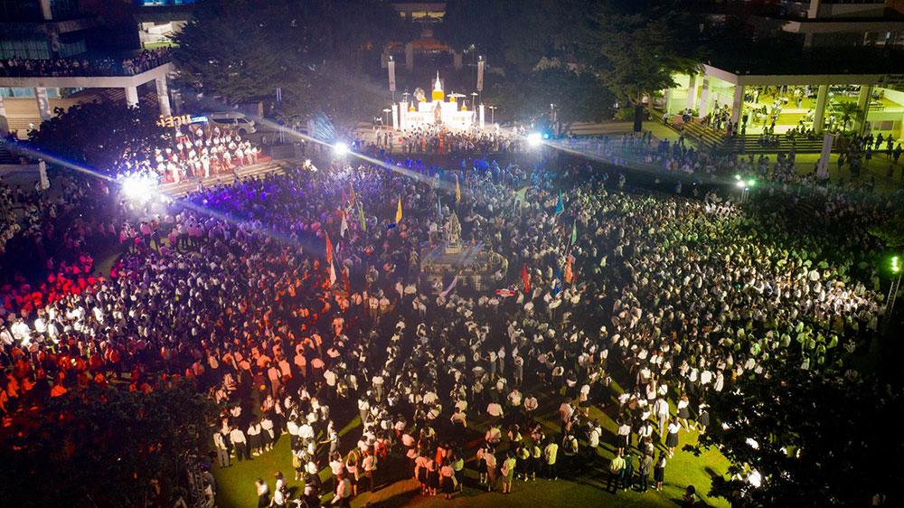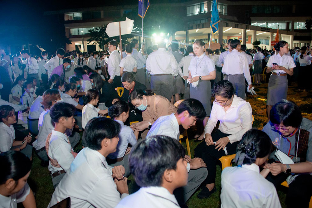 จากนั้นอธิการบดีมหาวิทยาลัยมหาสารคาม ประธานในพิธีจุดธูปเทียนบูชาพระพุทธกันทรวิชัย อภิสมัยธรรมนายก และจุดเทียนชัยยอดบายศรีสู่ขวัญ เพื่อความเป็นสิริมงคล