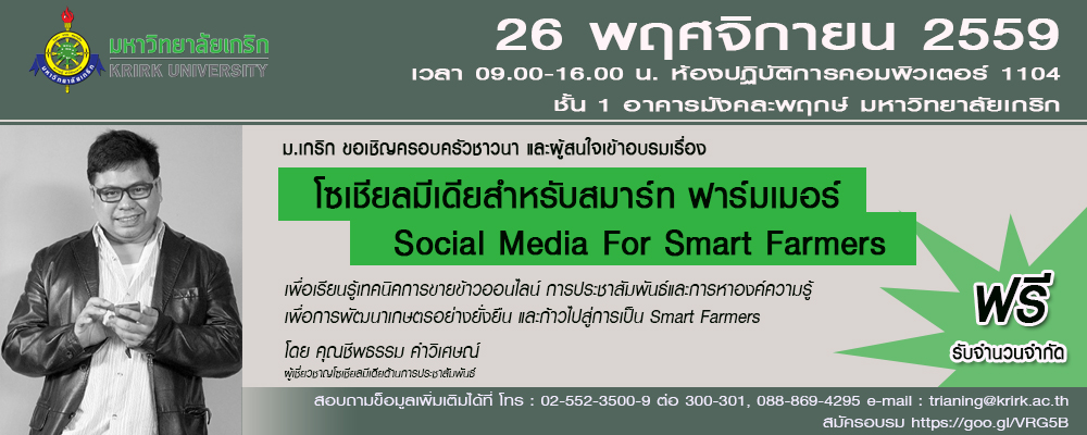 มหาวิทยาลัยเกริก จัดหลักสูตรอบรมฟรี! สำหรับครอบครัวชาวนาและผู้สนใจทั่วไป เรื่อง “โซเชียลมีเดียสำหรับสมาร์ท ฟาร์มเมอร์” (Social Media For Smart Farmers) โดยวิทยากรผู้เชี่ยวชาญ : คุณชีพธรรม คำวิเศษณ์ มาให้ความรู้ด้านโซเชียลมีเดียเพื่อการประชาสัมพันธ์ และเรียนรู้เทคนิคการขายข้าวออนไลน์ เพื่อพัฒนาเกษตรกรไทยสู่การเป็น Smart Farmers