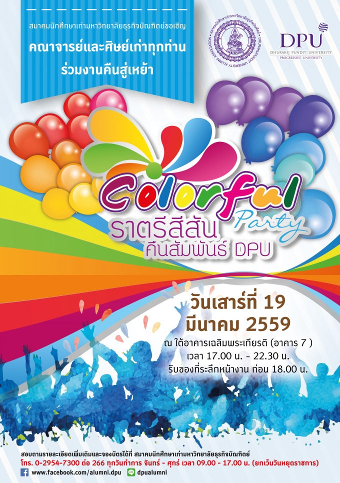 DPU ขอเชิญคณาจารย์และศิษย์เก่าทุกท่านร่วมงาน คืนสู่เหย้า “Colorful Party ราตรีสีสัน คืนสัมพันธ์ DPU”