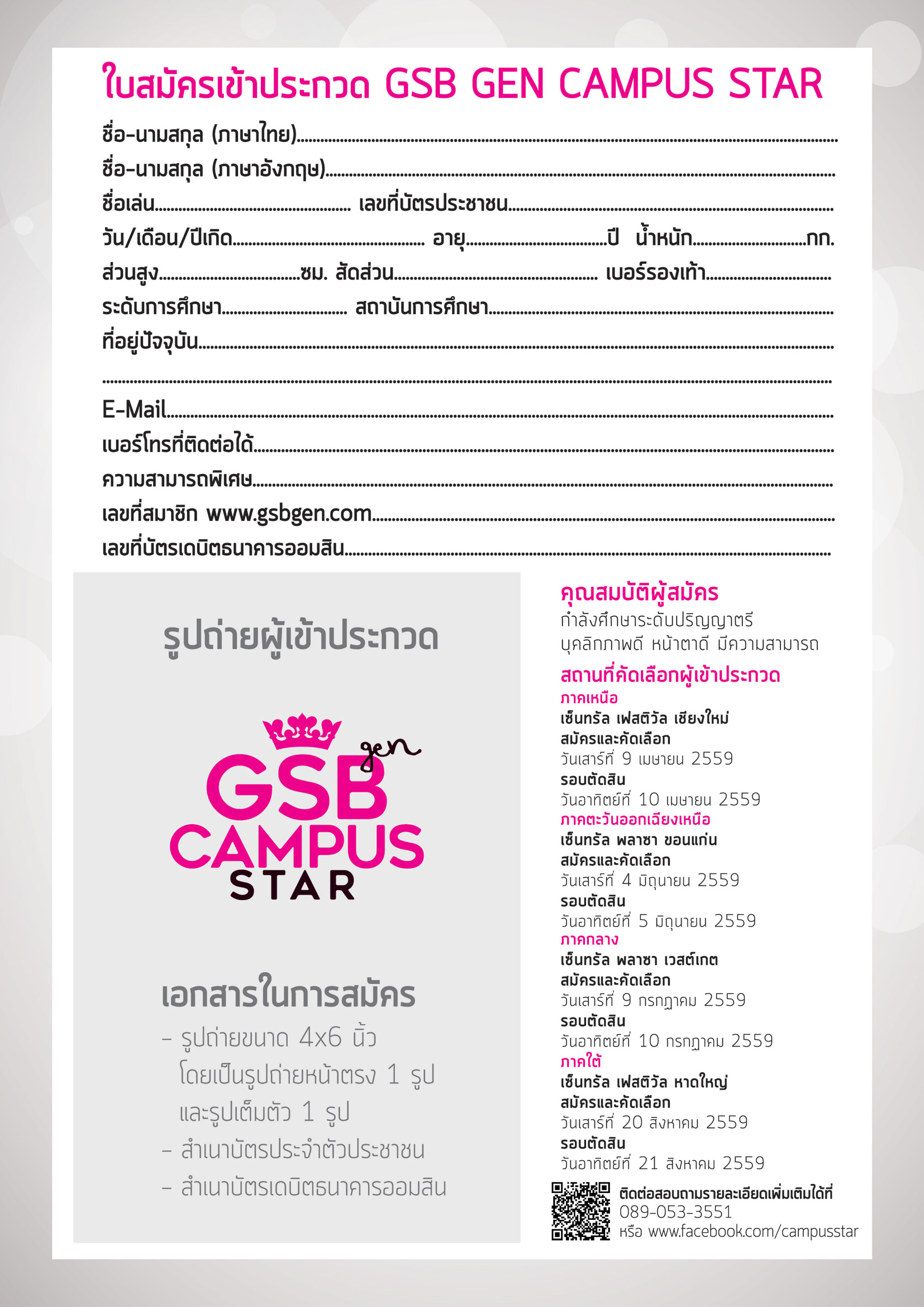 เริ่มสมัครการประกวด GSB Gen Campus Star ได้แล้วตั้งแต่วันนี้ โดยสถานที่คัดเลือกผู้เข้าประกวด แบ่งตามภูมิภาค