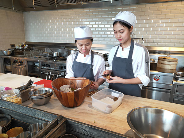 ดรีม : หลักๆ เลยตอนเช้าหนูได้รับหน้าที่ให้ยืนตรง Line Buffet ที่ห้องอาหาร The Brasserie ค่ะ อยู่ในส่วนของ Bakery ต้องคอยทำ Pancake Waffle และ French Toast เสิร์ฟแขกที่มาสั่ง ได้พูดคุยกับแขกด้วย พอตอนบ่ายก็จะช่วยพี่ๆ เตรียมของที่ใช้ออก Breakfast ในวันถัดไป พอเสร็จทุกอย่างก็จะคอย Support พี่ๆ ในช่วง Dinner ซึ่งจริงๆ แล้วงานที่รับผิดชอบในแต่ละวันก็จะต่างกันไป เพราะงานครัวเป็นงานที่มีรายละเอียดเยอะ แล้วแต่ว่าพี่เขาจะมอบหมายงานอะไรให้ทำเพิ่มเติม