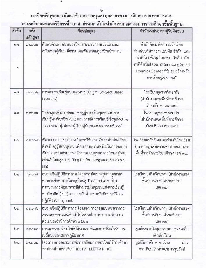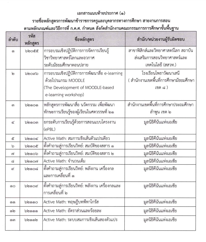 โดยได้มีการแบ่งประกาศออกเป็น 3 ฉบับด้วยกัน ได้แก่ ประกาศครั้งที่ 1/2562 จำนวน 29 หลักสูตร, ประกาศครั้งที่ 2/2562 จำนวน 45 หลักสูตร และประกาศครั้งที่ 3/2562 จำนวน 13 หลักสูตร มีรายละเอียดในแต่ละหลักสูตรที่ใช้อบรมในการพัฒนาครู ดังต่อไปนี้