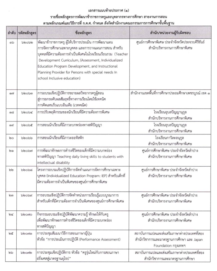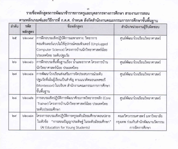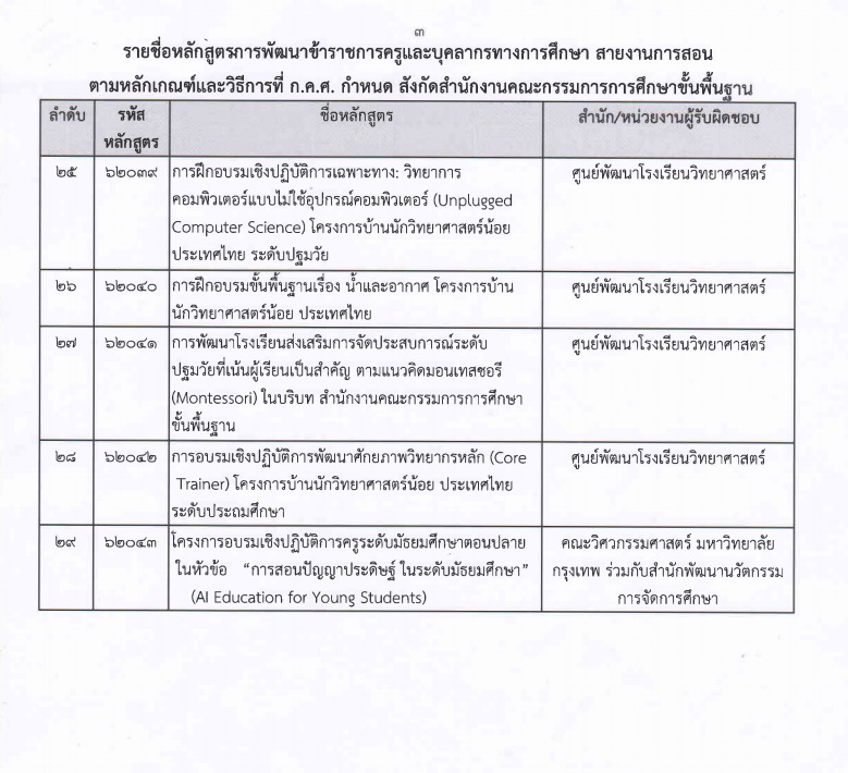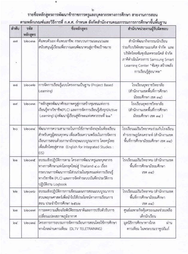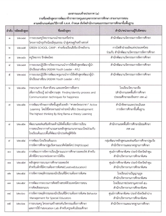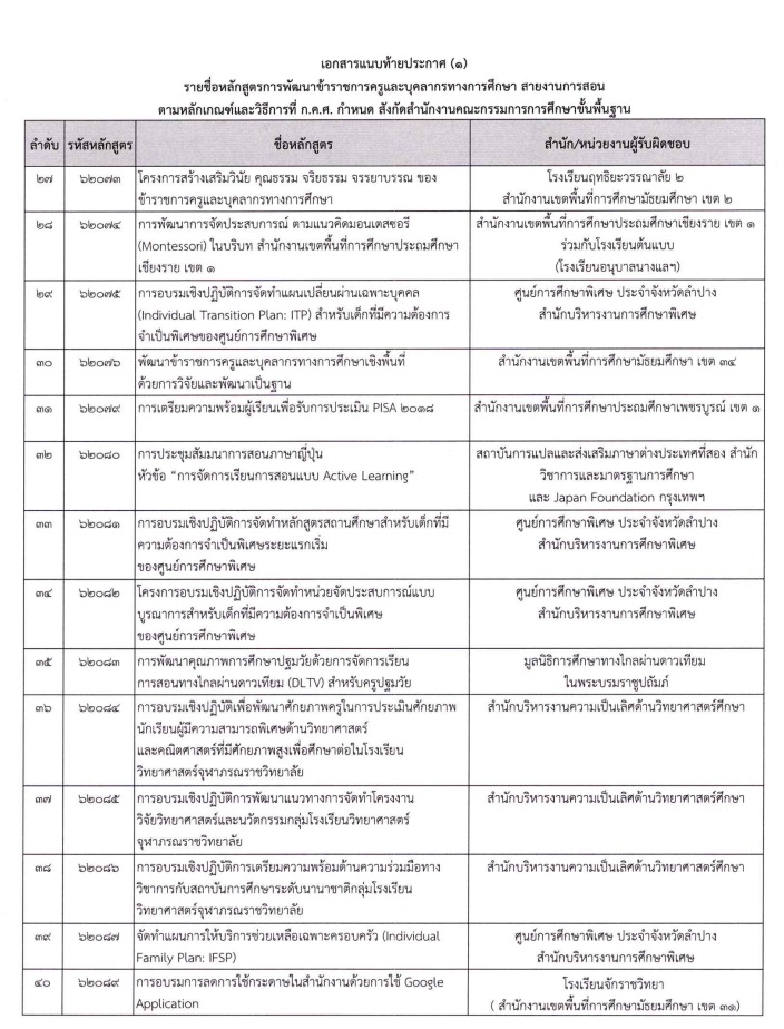 สำนักงานคณะกรรมการการศึกษาขั้นพื้นฐาน หรือ สพฐ ได้ประกาศรายชื่อหลักสูตรการพัฒนาข้าราชการครูและบุคลากรทางการศึกษา จำนวน 87 หลักสูตร โดยได้มีการจัดทำหนังสือแจ้งไปยังสำนักงานเขตพื้นที่การศึกษา มัธยมศึกษา และสำนักบริหารงานการศึกษาพิเศษ