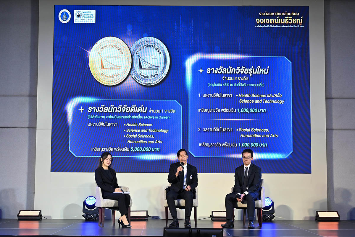 ด้าน ศ.นพ.ม.ล.ชาครีย์ กิติยากร รองอธิการบดีฝ่ายวิจัย มหาวิทยาลัยมหิดล กล่าวว่า การมอบรางวัล ในปี 2569 นี้ จัดขึ้นภายใต้แนวคิด ‘Real-World Impact for Sustainability’ครอบคลุม 3 สาขาหลัก ได้แก่ 1. วิทยาศาสตร์สุขภาพ 2. วิทยาศาสตร์และเทคโนโลยี 3. สังคมศาสตร์ มนุษยศาสตร์และศิลปะ แบ่งออกเป็น 2 ประเภท ได้แก่ รางวัลนักวิจัยดีเด่น (ไม่จำกัดอายุ) 1 รางวัล สำหรับนักวิจัยที่มีผลงานโดดเด่นและสร้างคุณูปการแก่สังคมอย่างต่อเนื่อง เงินรางวัล 5 ล้านบาท และรางวัลนักวิจัยรุ่นใหม่ (อายุไม่เกิน 45 ปี) 2 รางวัล