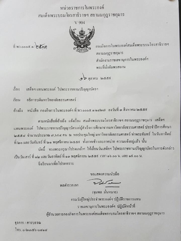 ประกาศจากหน่วยราชการในพระองค์ แจ้งเรื่อง สมเด็จพระบรมโอรสาธิราชฯ สยามมกุฎราชกุมาร เสด็จแทนพระองค์ ไปพระราชทานปริญญาบัตรแก่ผู้สำเร็จการศึกษาจากมหาวิทยาลัยธรรมศาสตร์ ประจำปีการศึกษา 2558 เลื่อนวันพระราชทานให้เร็วขึ้น!!