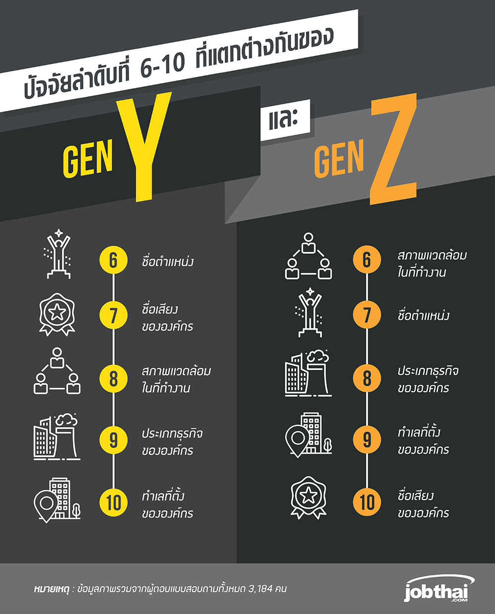 ในขณะที่ Gen Y ให้ความสำคัญกับชื่อตำแหน่ง ชื่อเสียงองค์กร สภาพแวดล้อมในที่ทำงาน ประเภทธุรกิจ และทำเลที่ตั้ง ตามลำดับ ซึ่งจะเห็นว่า Gen Z ให้ความสำคัญกับสภาพแวดล้อมมากกว่าการสนใจเรื่องชื่อเสียงองค์กร ในขณะที่ Gen Y ให้ความสำคัญกับเรื่องชื่อตำแหน่งและชื่อเสียงองค์กรมากกว่า อาจเป็นเพราะ Gen Y เข้าสู่ช่วงชีวิตการทำงานที่มีตำแหน่งงานอยู่ในระดับกลางถึงสูง ดังนั้นจึงให้ความสำคัญกับเรื่องชื่อตำแหน่ง และชื่อเสียงองค์กรมากกว่า Gen Z