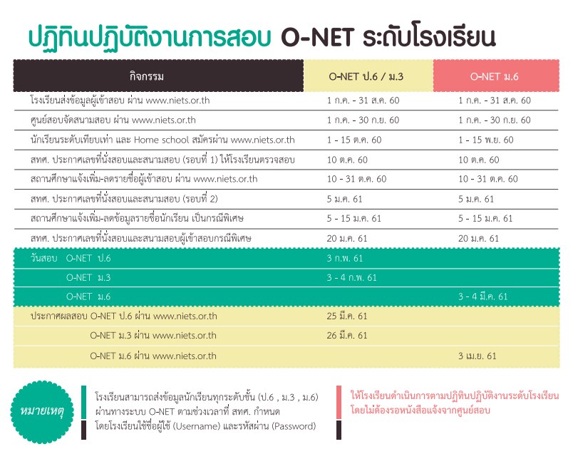 กำหนดการ O-NET ระดับโรงเรียน ปีการศึกษา 2560