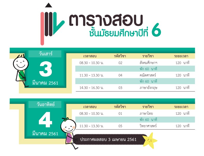 ทั้ง ป.6 ม.3 และ ม.6 จะเริ่มสอบพร้อมกันในวันเสาร์ที่ 3 กุมภาพันธ์ 2561