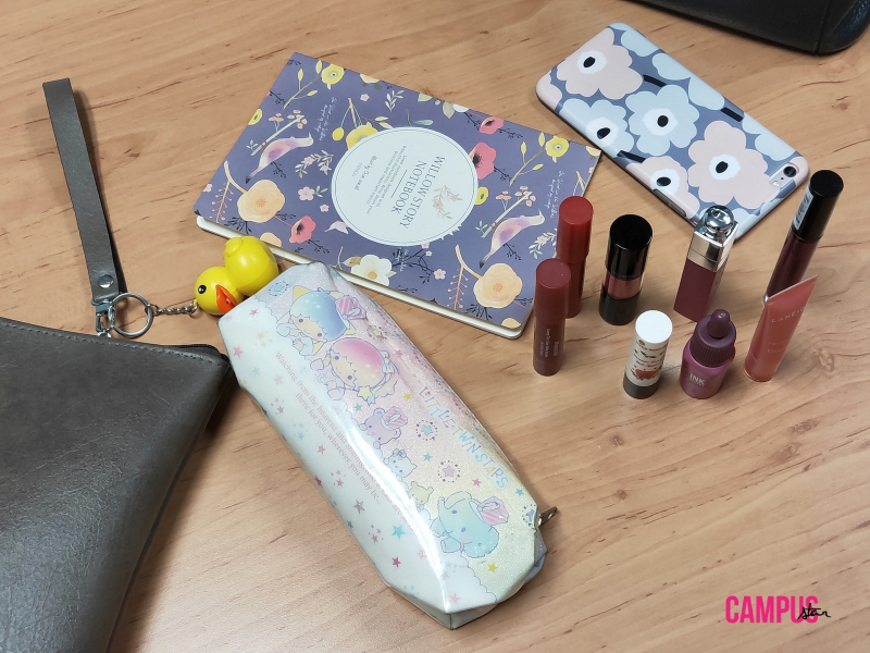 ไอเท็มที่ขาดไม่ได้ : กระเป๋าดินสอลาย Little Twin Stars กับลิปสติก เวลาพกลิปจะพกมาหลายแท่ง แล้วแต่อารมณ์ว่าอยากทาสีนี้ๆ เพื่อนจะชอบแซวว่า “ปากไม่แดงไม่มีแรงเดิน”