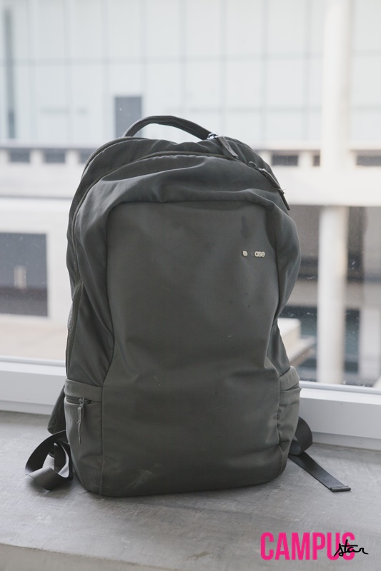กระเป๋าเป้ยี่ห้อ Incase รุ่นนี้ซัพพอร์ตดีมาก มันมีฟองน้ำนุ่ม ช่วยปกป้องโน๊ตบุ๊ก แล้วก็ซัพพอร์ตหลังของผมได้ดีด้วย ผมเป็นคนชอบสีโทนสบายๆ ประมาณเทาอ่อนๆ ในกระเป๋าก็จะมีหนังสือ อุปกรณ์พวกปากกา ดินสอ โน๊ตบุ๊ก เครื่องคิดเลข แล้วก็ชุดกีฬา เพราะเลิกเรียนแล้วชอบนัดเพื่อนๆ ไปวิ่งในสวนหรือซ้อมมวยที่คณะ ส่วนเงินไม่ค่อยพก จะใช้ค่อยไปกดเอา ในกระเป๋าเลยมีแค่บัตรเป็นส่วนใหญ่