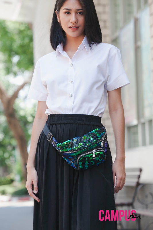 ชอบเป็นกระเป๋าใบเล็กๆ แล้วก็ถือหนังสือแยกออกมาอีกที เราจะมีตู้หนังสือประจำที่มออยู่ ก็จะชอบไปนั่งตรงนั้น แล้วก็ฝากหนังสือที่ถือเอาไว้เลย ส่วนใหญ่ก็ใส่พาวเวอร์แบงก์ โทรศัพท์ หูฟัง ชอบที่มันเป็นเลื่อมๆ หน่อย เพราะหนูใส่เสื้อสีดำเป็นส่วนใหญ่ไง ก็เลยต้องหาเลื่อมๆ สีๆ อย่างใบนี้เขียวน้ำเงินม่วงแบบนี้มาตัดกับเสื้อบ้าง