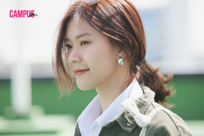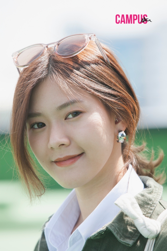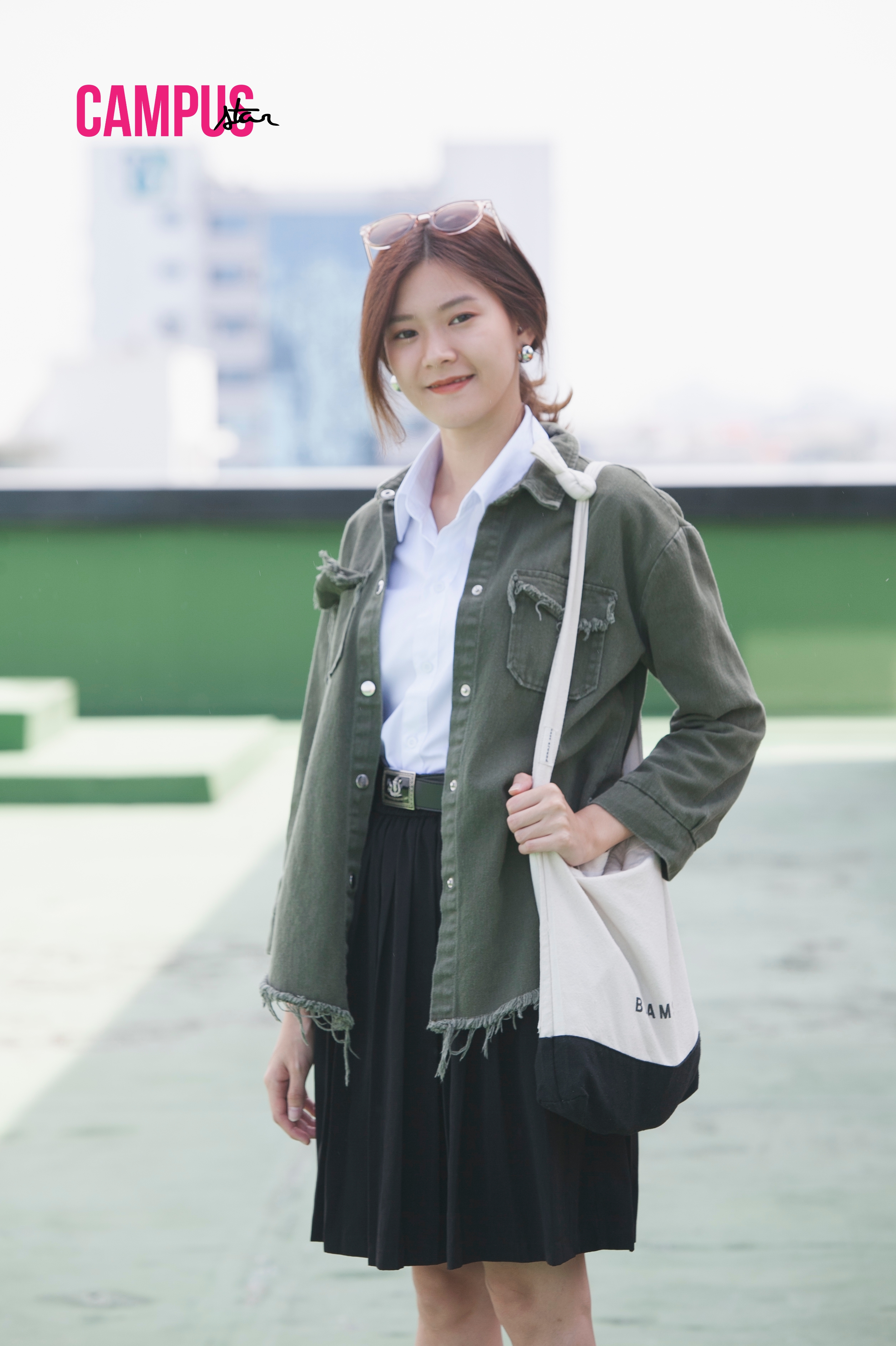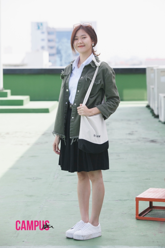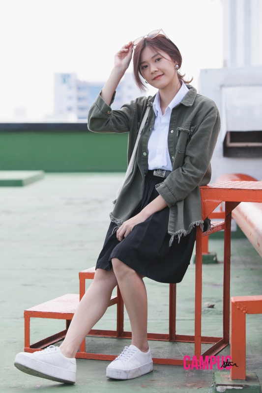 “เรียนปี 4 คณะมนุษยศาสตร์ ภาควิชาปรัชญาและศาสนา ม.เกษตรศาสตร์ ที่เลือกสาขานี้เพราะคิดว่ามันเป็นสิ่งที่ใช้ได้ในชีวิตประจำวัน แล้วก็อาจจะเอาต่อยอดแต่งเพลงได้ด้วย ก็ชอบบรรยากาศที่นี่ค่ะ ร่มรื่นดี มาที่นี่ก็สนุกได้ทำกิจกรรมเยอะ ม.เกษตรศาตร์มีกิจกรรมเยอะอยู่แล้ว เพื่อนๆ ที่สนิทส่วนใหญ่เป็นผู้หญิง ในภาคมีกันแค่ 21 คนเอง เนิร์ดๆ หน่อย แต่ก็มีความแก่น ความซนนิดๆ อยู่บ้าง มามอหนูไม่ชอบแต่งอะไรเยอะ หน้าก็แค่เขียนคิ้ว ปัดแก้มเบาๆ ออกมาเลย เป็นคนขี้เกียจแต่งตัวอยู่แล้ว ข้างนอกก็ชอบใส่เสื้อยืดกางเกงยีนส์สบายๆ”
