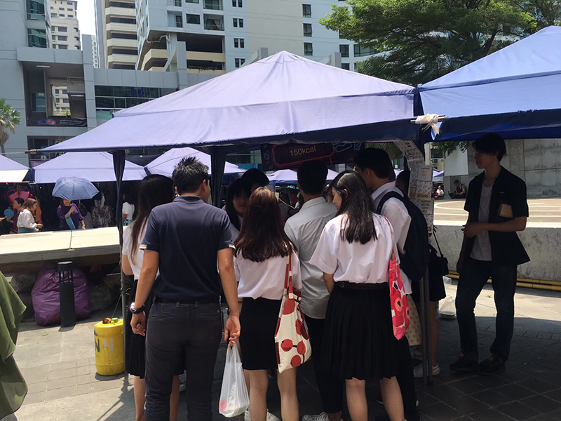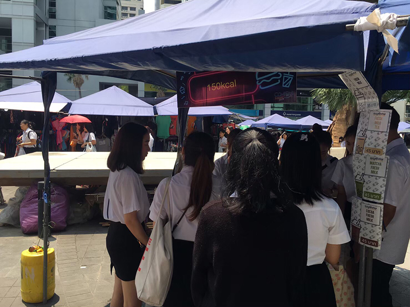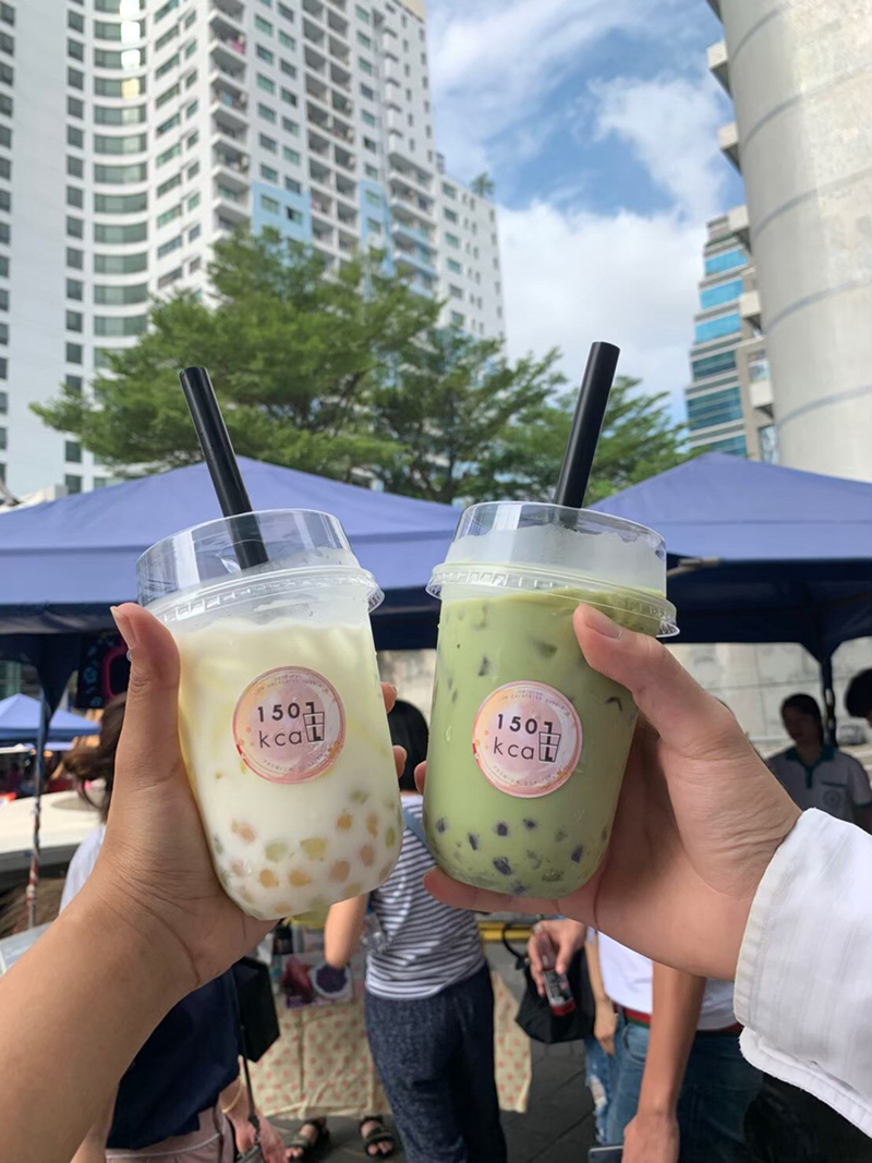 “มันเริ่มมาจากธีสิสก่อน เป็นกลุ่มทำกัน 5 คน เราอยากทำธีสิสที่สามารถนำไปต่อยอดหลังเรียนจบหรือนำไปสร้าง Value ให้เราได้ ก็มาหาจุดตรงกลางว่าพวกเราทุกคนชอบอะไร เรารู้จุดเด่นว่าทุกคนชอบกินชานมไข่มุก ก็เลยอยากทำนวัตกรรมสำหรับวงการนี้ขึ้นมา ขั้นตอนต่อไปก็คือหาข้อมูลว่าแล้วชานมไข่มุกในท้องตลาดมีปัญหาอะไรอยู่บ้าง ที่จะช่วยแก้ปัญหาให้คนในสังคม แล้วก็สร้างรายได้ให้ตัวเองด้วย เราก็เจอปัญหาว่าคนเราอยากกินชานมไข่มุกแต่กลัวอ้วน แล้วร้านชานมไข่มุกทั่วไปจะใช้นมผงซึ่งทำให้แคลอรีเยอะ ทำจากไขมันก็ไม่ดีต่อสุขภาพ เราก็เลยได้ไอเดียทำยังไงให้กินชานมไข่มุกแบบมีความสุขมากขึ้นและดีต่อสุขภาพ เราอยากทำเครื่องดื่มที่เป็นออแกนิคจากธรรมชาติ 100% ซึ่งในเมืองไทยหายากมากๆ เลยเกิดเป็นร้าน 150kcal ที่ปกติชานมไข่มุกในท้องตลาดจะมีแคลอรีที่ประมาณ 300-400 แคลอรี ก็ลดมาเหลือ 150 และไม่ใช้น้ำตาลเลย แต่ใช้เป็นหญ้าหวานแทน บวกกับรสชาติของชานมไข่มุกที่มีถึง 3 รสชาติ คือ หญ้าหวาน มันม่วง แล้วก็เต้าหู้ เพิ่มความหลากหลายให้ผู้บริโภค”