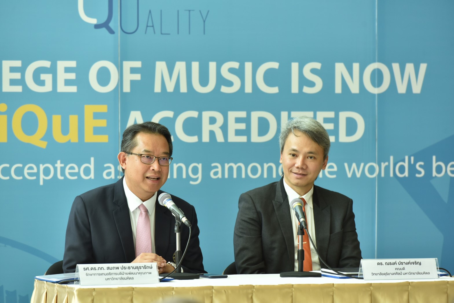 รองศาสตราจารย์ ดร.ภก.สมภพ ประธานธุรารักษ์ รักษาการแทนรองอธิการบดีฝ่ายพัฒนาคุณภาพ มหาวิทยาลัยมหิดล เปิดเผยว่าการที่วิทยาลัยดุริยางคศิลป์ มหาวิทยาลัยมหิดล ได้รับการรับรองมาตรฐานในระดับนานาชาติ ถือเป็นตัวชี้วัดที่สะท้อนถึงคุณภาพในการดำเนินงาน โดยมหาวิทยาลัยมหิดลได้เริ่มจากการพัฒนาเกณฑ์ MUQD มาใช้ในเบื้องต้น จากนั้นได้เริ่มนำเกณฑ์ EdPEx เข้ามาใช้และมีการตรวจประเมิน สำหรับระดับหลักสูตรเริ่มนำเกณฑ์ AUN-QA (Asian University Network – Quality Assessment)มาใช้เมื่อปี พ.ศ. 2554 และเริ่มพัฒนาสู่การปฏิบัติทั่วทั้งมหาวิทยาลัย