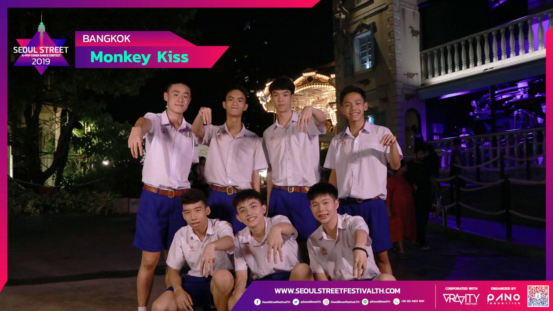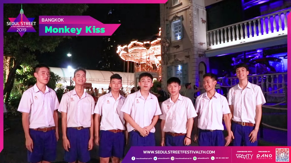 และล่าสุด! น้อง ๆ วง MONKEY KISS ก็ได่เข้าร่วมการแข่งขัน Seoul Street K-pop Cover Dance Contest 2019 โดยในรอบ K-pop in public (Seoul Street x KPOP IN PUBILC CHALLENGE) ซึ่งเป็นคอนคอนเซ็ปต์เต้นโคฟเวอร์ในที่สาธารณะ โดยน้อง ๆ วง MONKEY KISS ก็ได้เลือกโคฟเวอร์เป็นวงไอดอลเกาหลีสุดฮอตอย่าง BTS (บังทันโซยอนดัน : 방탄소년단) ในเพลง Blood Sweat & Tears และสถานที่ที่น้อง ๆ ทำการแสดงในครั้งนี้ก็คือ เอเชียทีค