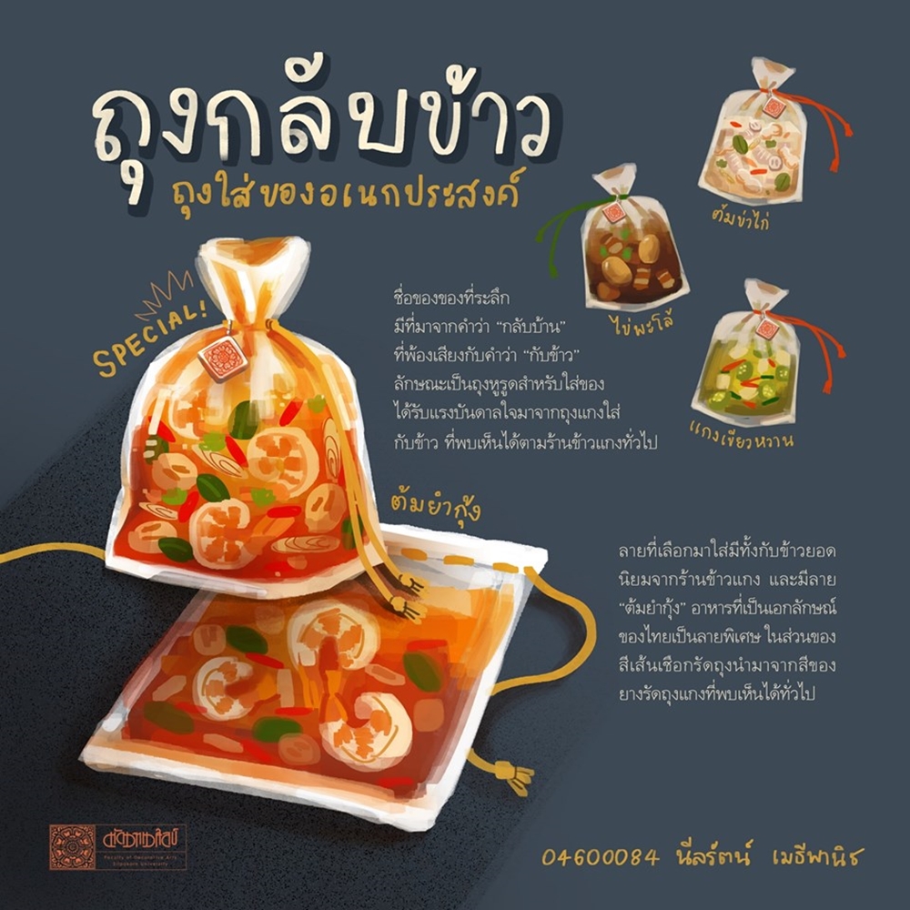 น้อง ๆ นักศึกษาได้ถอดรหัสความเป็นไทยออกมาผสมผสานกับไอเดียความสร้างสรรค์กันได้หลากหลาย และน่าสนใจมาก ๆ จากสิ่งของที่ใช้ที่พบเห็นในชีวิตประจำวัน ยกตัวอย่างเช่น ถุงกับข้าว ใบตองห่ออาหาร กระเป๋ารถเมล์ ลอตเตอรี่ ฯลฯ ออกมาเป็นของที่ระลึกสวย ๆ คอนเซปท์เก๋ ๆ เห็นแล้วน่าซื้อมาครอบครอง