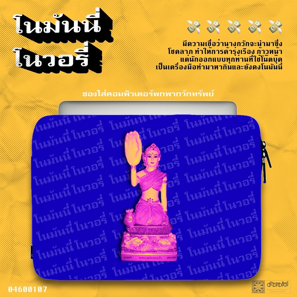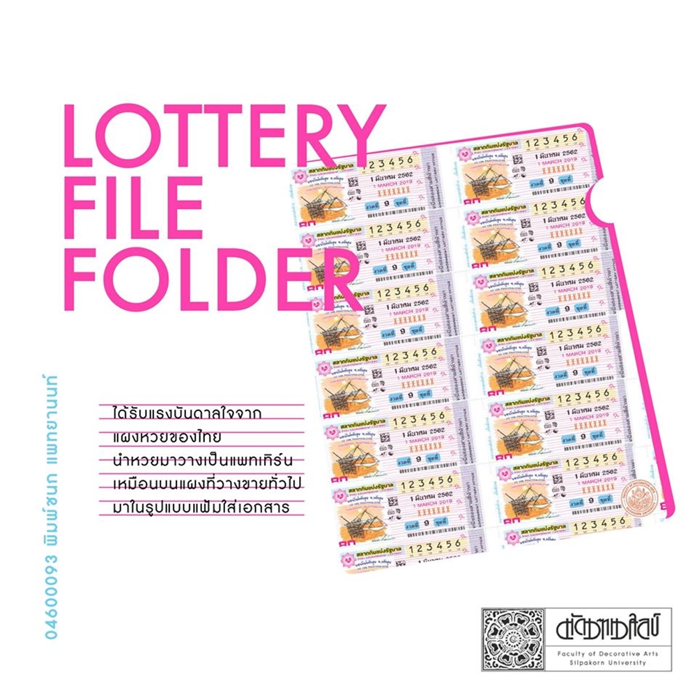 แค่เห็นก็รู้ได้เลยว่าแรงบันดาลใจมาจาก ลอตเตอรี่ แผงหวยของไทย นำมาสร้างสรรค์ด้วยการทำเป็นแฟ้มใส่เอกสารวางลายเป็นแพทเทริ์นเหมือนบนแผงหวยที่วางขายทั่วไป