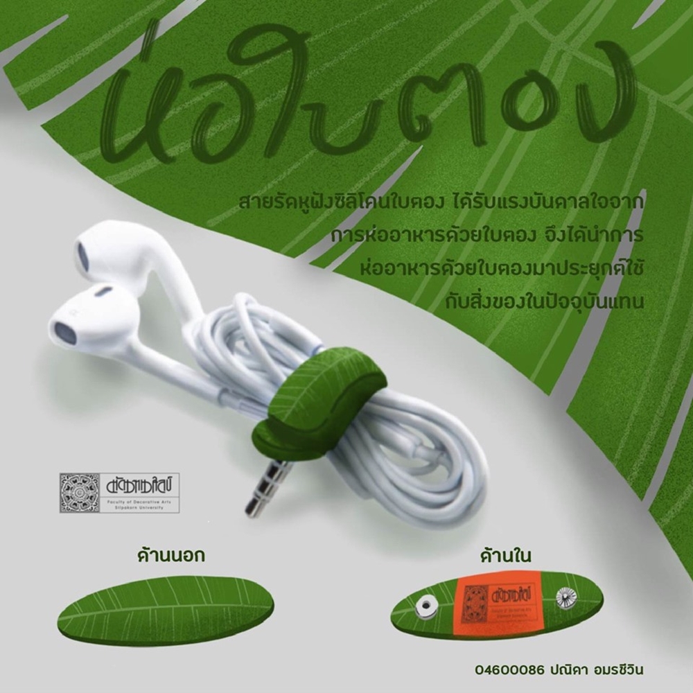 ห่อใบตอง (สายรัดหูฟังซิลิโคนใบตอง) ผลงานของ ปณิดา อมรชีวิน ได้รับแรงบันดาลใจมาจากการห่ออาหารด้วยใบตอง