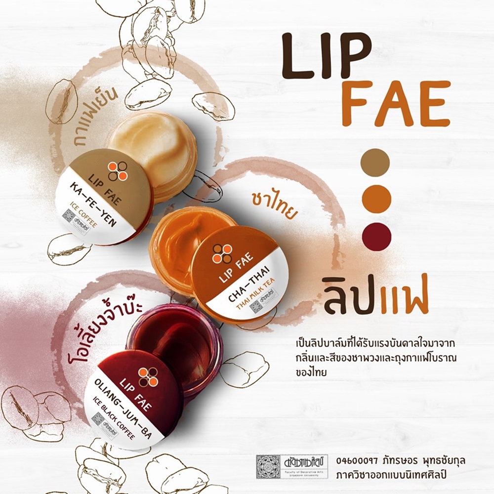 ลิปแฟ เป็นลิปบาล์มที่ได้แรงบันดาลใจมาจาก กลิ่นและสีของชาพวงและถุงกาแฟของไทย