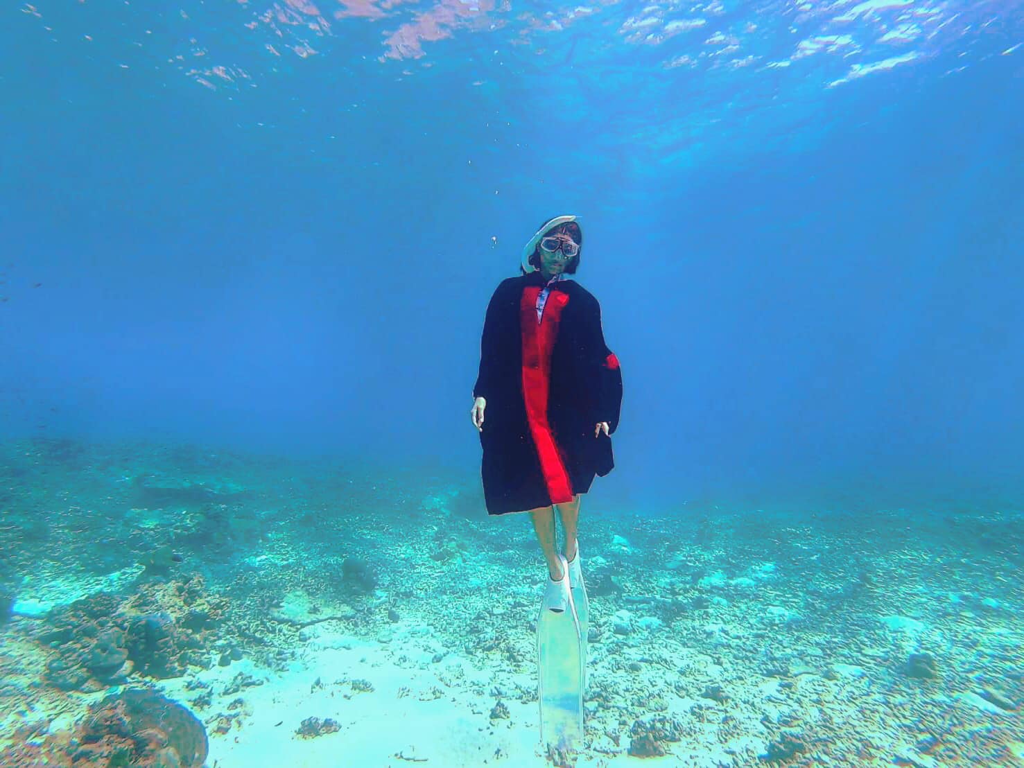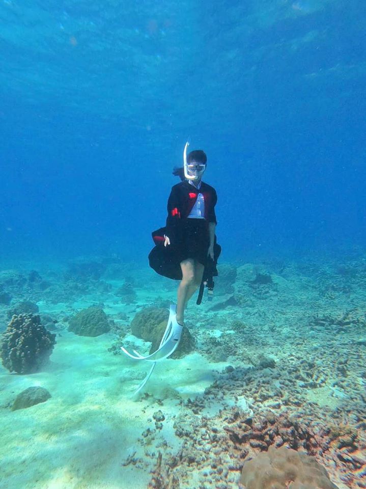 เห็นเค้าชอบถ่ายนอกรอบรับปริญญากันความใบตองถ่ายยังไงไม่ให้ซ้ำ ก็ซื้อชุดครุยลงทะเลแม่ม🤣 เอาลูกเอา#freedive…