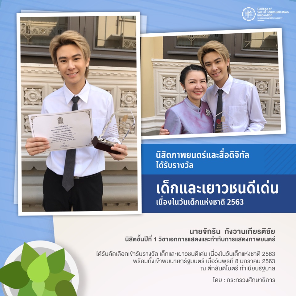 “นิสิตภาพยนตร์และสื่อดิจิทัล ได้รับรางวัลเด็กและเยาวชนดีเด่น ปี 2563 นายจักริน กังวานเกียรติชัย นิสิตชั้นปีที่ 1 วิชาเอกการแสดงและกำกับการแสดงภาพยนตร์ วิทยาลัยนวัตกรรมสื่อสารสังคม มหาวิทยาลัยศรีนครินทรวิโรฒ ได้รับคัดเลือกเข้ารับรางวัล เด็กและเยาวชนดีเด่น เนื่องในวันเด็กแห่งชาติ 2563 พร้อมทั้งเข้าพบนายกรัฐมนตรี เมื่อวันพุธที่ 8 มกราคม 2563 ณ ตึกสันติไมตรี ทำเนียบรัฐบาล โดย : กระทรวงศึกษาธิการ”
