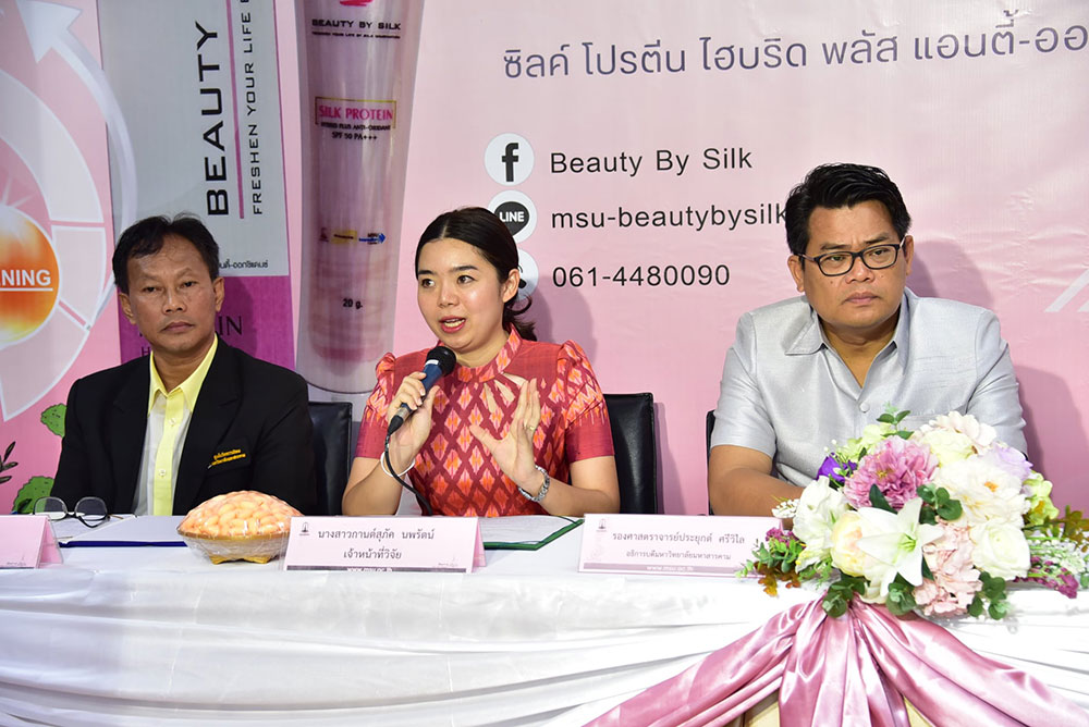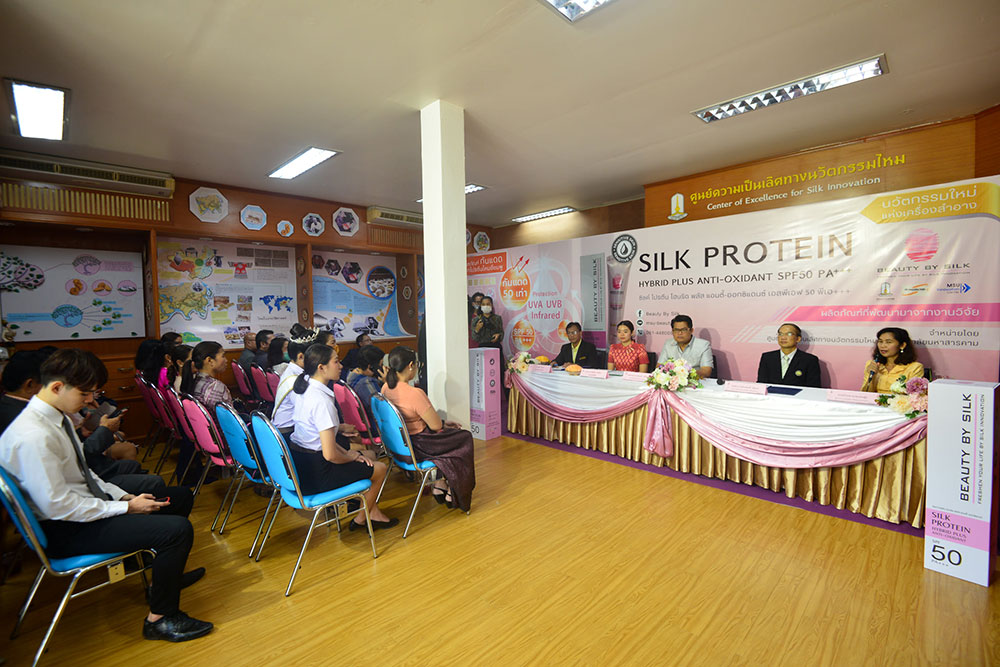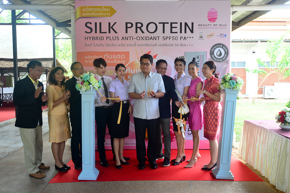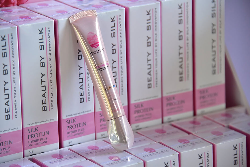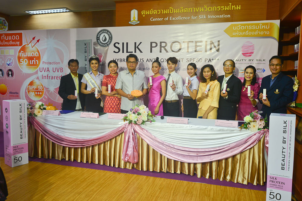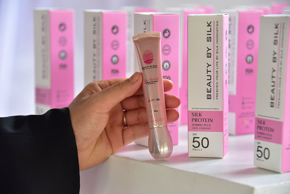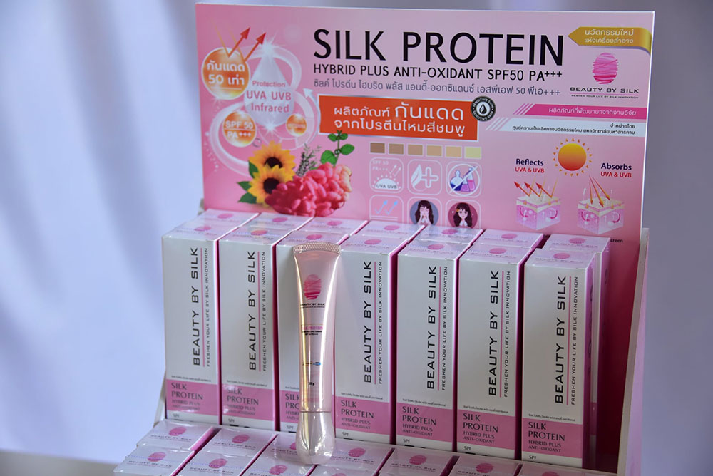 นางสาวกานต์สุภัค นพรัตน์ เจ้าหน้าที่วิจัย สังกัดศูนย์ความเป็นเลิศทางนวัตกรรมไหม มหาวิทยาลัยมหาสารคาม ผู้คิดค้นและพัฒนาสูตรผลิตภัณฑ์ฯ เปิดเผยว่า “ครีมกันแดดโปรตีนไหมสีชมพู”ภายใต้แบรนด์ BEAUTY BY SILK เป็นผลิตภัณฑ์ที่แตกต่างจากผลิตภัณฑ์ทั่วไป จุดกำเนิดมาจากความมุ่งมั่น ในการสร้างสรรค์นวัตกรรมทางวิชาการและความตั้งใจจริง ในการเพิ่มมูลค่านวัตกรรมของไทยอย่างยั่งยืน ด้วยคุณสมบัติทางชีวภาพที่มีความโดดเด่นของรังไหมไทย จึงก่อเกิดเป็นผลิตภัณฑ์กันแดด ที่มีส่วนผสมของโปรตีนไหมสีชมพู SPF 50 PA+++ สูตรใหม่เป็นสูตร HYBRID sunscreen รวม 2 นวัตกรรมระหว่าง Physical sunscreen และ Chemical sunscreen รวมไปถึงสารสกัดที่มีฤทธิ์ต่อต้านอนุมูลอิสระ ชะลอการชราและมีผลลดเลือนริ้วรอยอย่างมีประสิทธิภาพ ปลอดภัยไม่เกิดการแพ้หรือการระคายเคือง มีประสิทธิภาพในการกันแดดได้อย่างเห็นผล