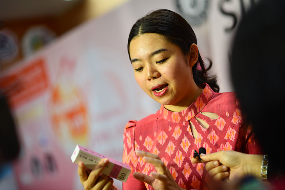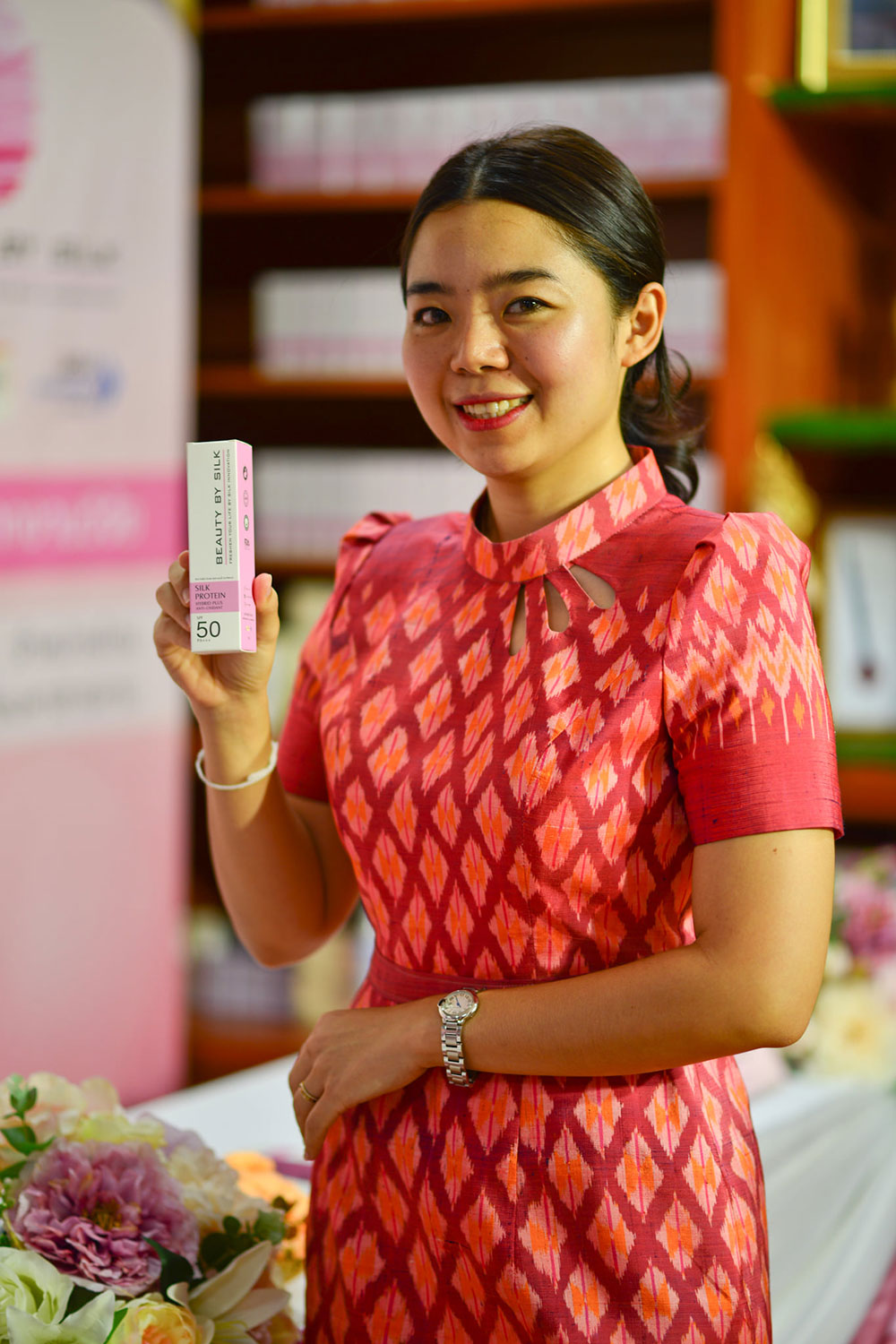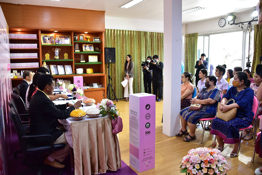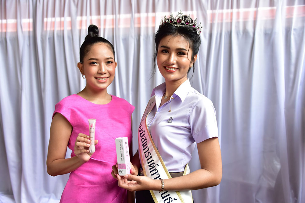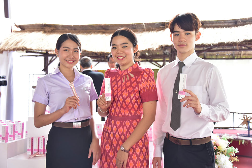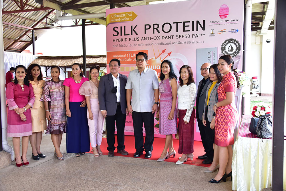 นางสาวกานต์สุภัค นพรัตน์ เจ้าหน้าที่วิจัย สังกัดศูนย์ความเป็นเลิศทางนวัตกรรมไหม มหาวิทยาลัยมหาสารคาม ผู้คิดค้นและพัฒนาสูตรผลิตภัณฑ์ฯ เปิดเผยว่า “ครีมกันแดดโปรตีนไหมสีชมพู”ภายใต้แบรนด์ BEAUTY BY SILK เป็นผลิตภัณฑ์ที่แตกต่างจากผลิตภัณฑ์ทั่วไป จุดกำเนิดมาจากความมุ่งมั่น ในการสร้างสรรค์นวัตกรรมทางวิชาการและความตั้งใจจริง ในการเพิ่มมูลค่านวัตกรรมของไทยอย่างยั่งยืน ด้วยคุณสมบัติทางชีวภาพที่มีความโดดเด่นของรังไหมไทย จึงก่อเกิดเป็นผลิตภัณฑ์กันแดด ที่มีส่วนผสมของโปรตีนไหมสีชมพู SPF 50 PA+++ สูตรใหม่เป็นสูตร HYBRID sunscreen รวม 2 นวัตกรรมระหว่าง Physical sunscreen และ Chemical sunscreen รวมไปถึงสารสกัดที่มีฤทธิ์ต่อต้านอนุมูลอิสระ ชะลอการชราและมีผลลดเลือนริ้วรอยอย่างมีประสิทธิภาพ ปลอดภัยไม่เกิดการแพ้หรือการระคายเคือง มีประสิทธิภาพในการกันแดดได้อย่างเห็นผล