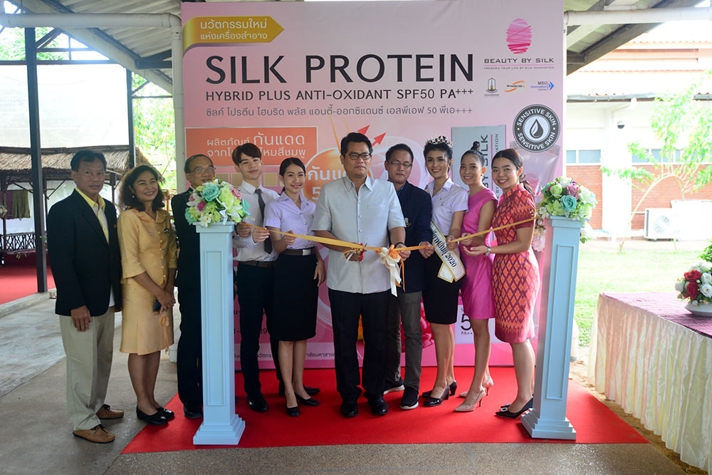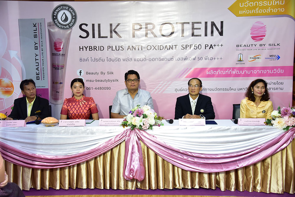 วันที่ 24 กันยายน 2563 มหาวิทยาลัยมหาสารคาม แถลงข่าวเปิดตัวผลิตภัณฑ์ “ ครีมกันแดดโปรตีนไหมสีชมพู ” SILK PROTEIN HYBRID PLUS ANTI-OXIDANT SPF 50 PA+++ โดยมี รองศาสตราจารย์ ดร.ประยุกต์ ศรีวิไล อธิการบดีมหาวิทยาลัยมหาสารคาม พร้อมด้วย ศาสตราจารย์ ดร.อนงค์ฤทธิ์ แข็งแรง รองอธิการบดีฝ่ายพัฒนาโครงสร้างพื้นฐาน วิจัยและนวัตกรรม, นางฉวีวรรณ อรรคะเศรษฐัง ผู้อำนวยการส่งเสริมการวิจัยและบริการวิชาการ, นายสุวัฒน์ พรมมา ฝ่ายเลี้ยงไหม และ นางสาวกานต์สุภัค นพรัตน์ เจ้าหน้าที่วิจัยผู้พัฒนาสูตรผลิตภัณฑ์ ร่วมแถลงข่าว ณ ห้องนิทรรศการศูนย์ความเป็นเลิศทางนวัตกรรมไหม มหาวิทยาลัยมหาสารคาม