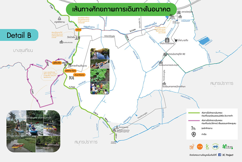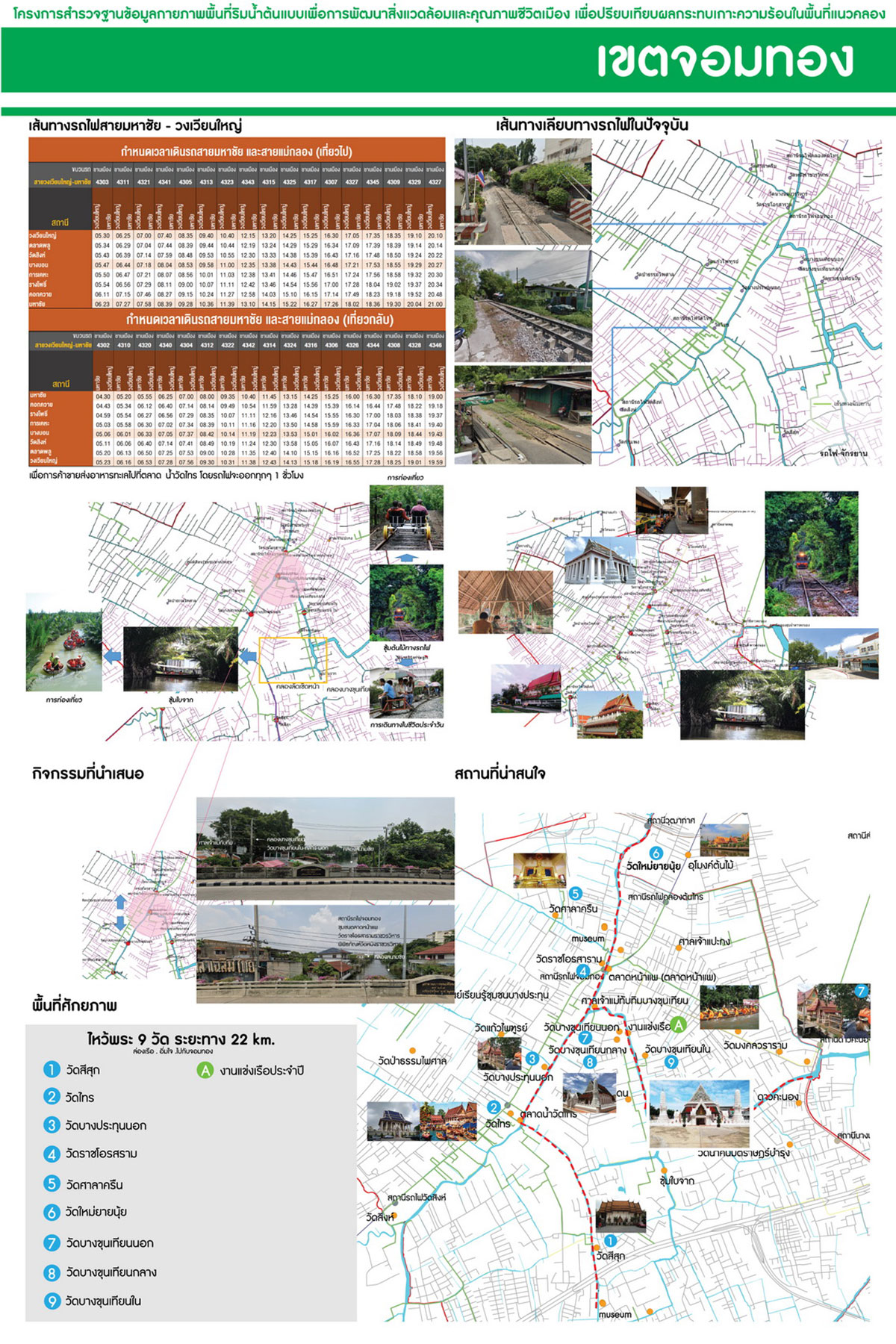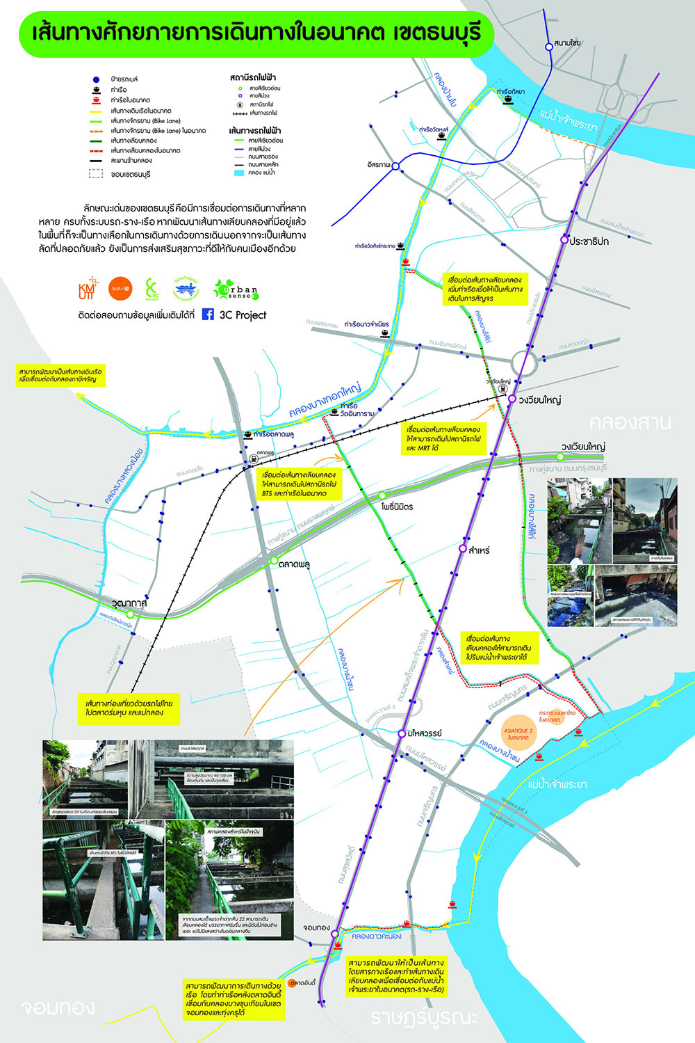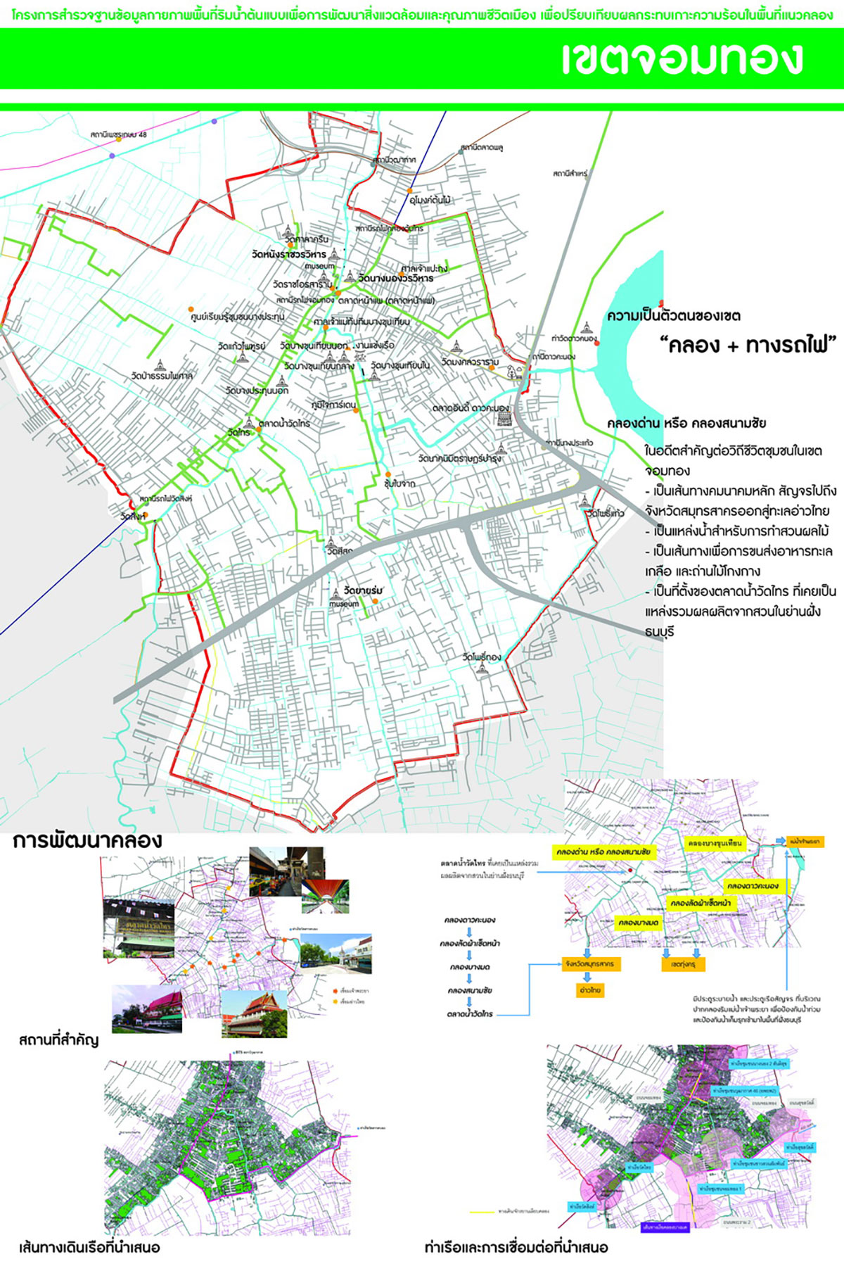 โครงการนี้ศึกษาและสำรวจพื้นที่คลองย่านฝั่งธนบุรี การสำรวจ 4 เขตนำร่อง ประกอบด้วย 1. เขตทุ่งครุที่มีโครงข่ายคลองเชื่อมโยงขนาดใหญ่ที่สามารถเชื่อมไปยัง 2. เขตจอมทอง 3. เขตธนบุรี และ 4. เขตคลองสาน เพื่อศึกษาคุณภาพน้ำคลอง คุณภาพสิ่งแวดล้อม รวมถึงศักยภาพของชุมชนริมน้ำ โดยข้อมูลที่ได้จะถูกนำมาวิเคราะห์ความเป็นไปได้ในการพัฒนาพื้นที่ท่องเที่ยวและเส้นทางเชื่อมต่อเส้นทางคลองในพื้นที่ฝั่งธนบุรี