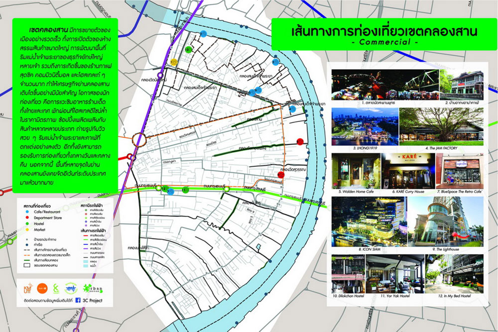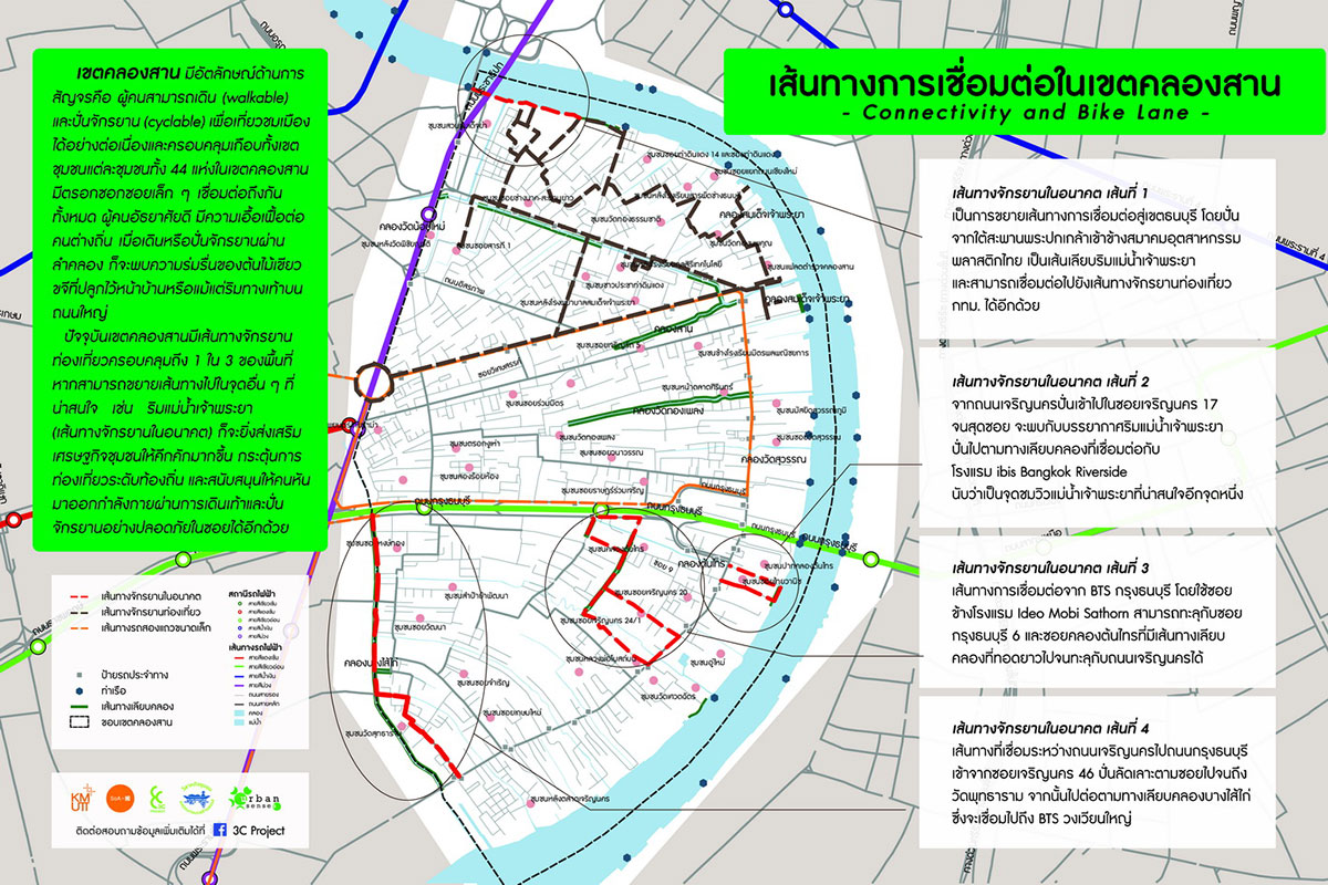 1. เรื่องการเดินทางและศักยภาพ พบว่า พื้นที่ทั้ง 4 เขตมีศักยภาพสูงมากในการเป็นเส้นทางที่เชื่อมต่อกันและเป็นเส้นทางสัญจรหลักในอนาคต ถ้าใช้คลองให้เกิดประโยชน์ เมื่อมีรถไฟฟ้าเข้ามาในพื้นที่ก็จะสามารถเชื่อมต่อได้อย่างดี แต่จากที่ได้สำรวจพบว่าปัจจุบันคลองหลายๆ สายในฝั่งธนบุรี เช่น คลองเขตธนบุรี และเขตคลองสาน เรือไม่สามารถผ่านได้ เนื่องจากลักษณะคลองที่แคบและตื้นเขิน อีกทั้งมีโครงสร้างหลายอย่างกีดขวางเส้นทาง นอกจากนี้คุณภาพน้ำสกปรกและมีกลิ่นเหม็น