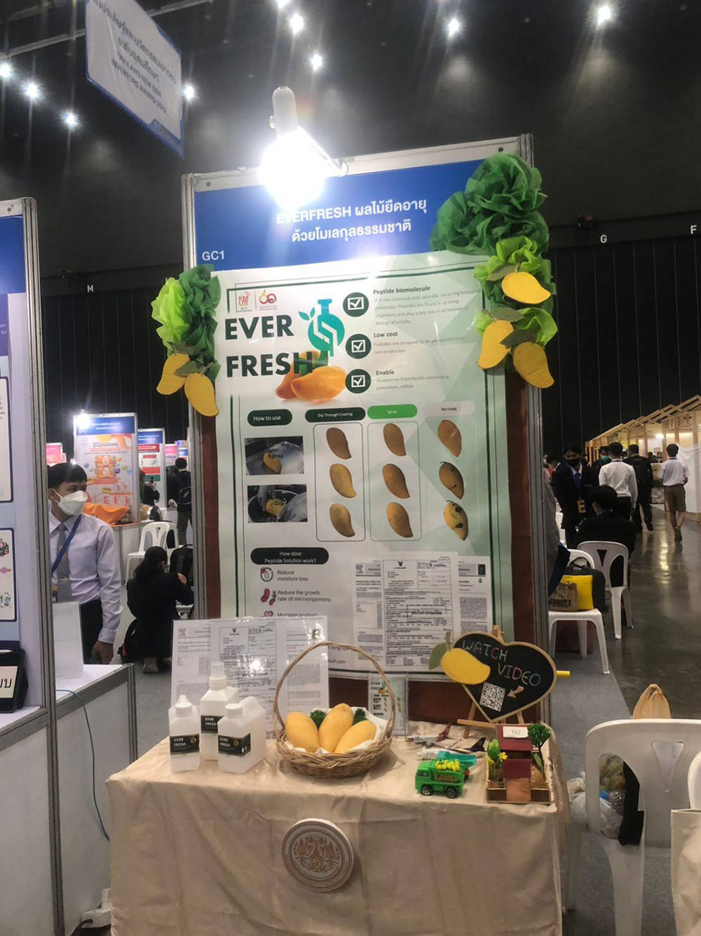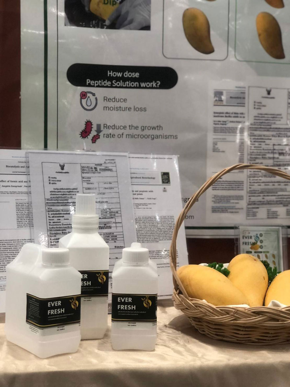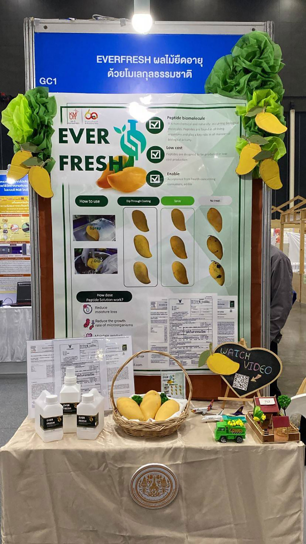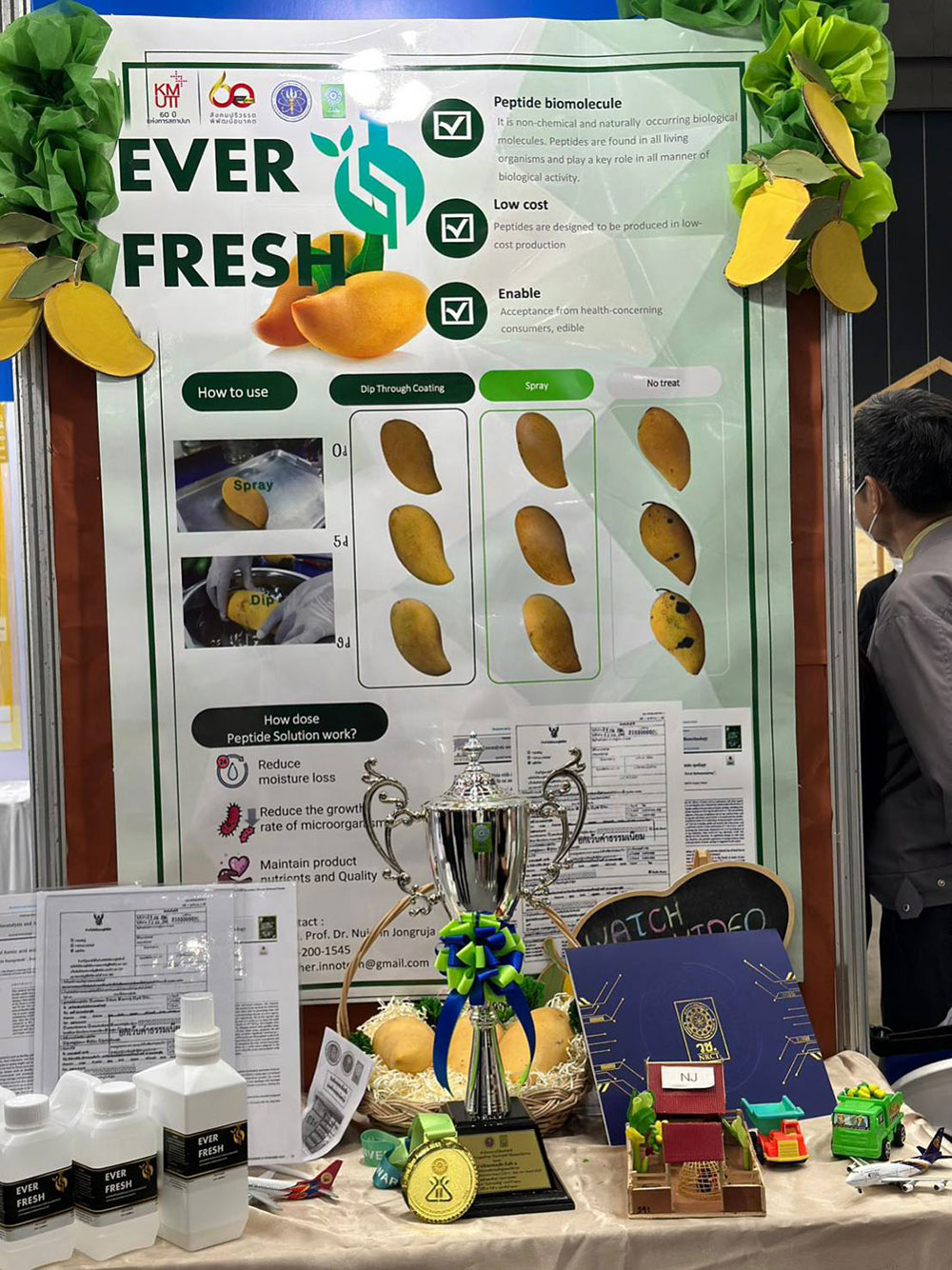 สันติ นกยอด หรือ แมน นักศึกษาปริญญาโท กล่าวว่า เพื่อชะลอการเน่าเสียและเพิ่มอายุการเก็บรักษาผลไม้ รวมทั้งลดปริมาณขยะอาหาร และลดต้นทุนในการขนส่ง ทีมผู้วิจัยจึงได้คิดค้นนวัตกรรมทางธรรมชาติ และเป็นมิตรต่อสิ่งแวดล้อมในการยืดอายุผลไม้ โดยได้ทำการพัฒนานวัตกรรมที่มีชื่อว่า “EVERFRESH ผลไม้ ยืดอายุด้วยโมเลกุลธรรมชาติ” ขึ้น เป็นผลิตภัณฑ์ที่ผลิตได้จากสารธรรมชาติ มีคุณสมบัติที่สามารถยืดอายุผลไม้ทำให้สามารถเก็บรักษาได้นานยิ่งขึ้นและง่ายต่อการใช้งาน ถูกพัฒนาขึ้นจากการผสมระหว่างสารชีวโมเลกุลต่างๆ ซึ่งเป็นสารที่รับประทานได้ และได้รับอนุญาตให้ใช้ในอาหาร มีการใช้อัตราส่วนของสารชีวโมเลกุลต่างๆ ด้วยอัตราส่วนที่เหมาะสมและใช้กระบวนการเฉพาะในการผลิตทำให้เกิดประสิทธิภาพสูงในการยับยั้งเชื้อจุลินทรีย์มากกว่าสารคลอรีนเดิมที่มีการใช้กันในปัจจุบัน