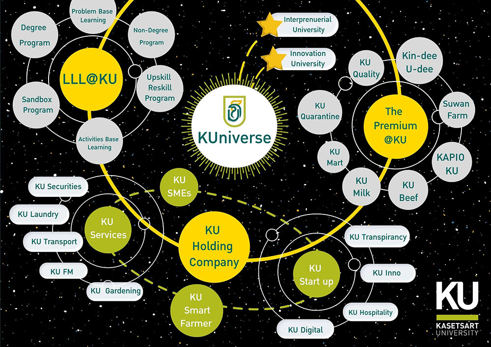 “ ในปี 2566 นี้ มหาวิทยาลัยเกษตรศาสตร์ครบรอบ 80 ปี และในอีก 20 ปี จะครบ 1 ศตวรรษ มหาวิทยาลัยจึงได้พลิกโฉมการเรียนรู้แบบใหม่ ผ่านโครงการที่มีชื่อว่า KUniverse เพื่อทำให้มหาวิทยาลัยเกษตรศาสตร์ โดดเด่นในระดับโลกอย่างแท้จริง