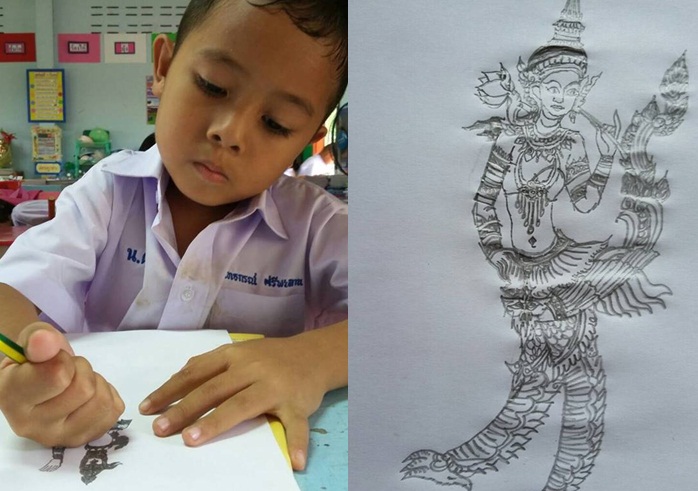 บางวันไอซ์ค้นหนังสือที่มีไม่มากจากในห้องเรียน เดินมาถามครูว่าภาพที่เห็นคืออะไร “กินรีลูก” ครูตอบ “ไอซ์จะวาดกินรีครับ” ไอซ์พูดสั้นๆ แล้วลงมือวาดรูปด้วยท่าทางที่ถนัด ผ่านไปสิบนาทีนิดๆ ภาพกินรีก็ปรากฏบนกระดาษ ไอซ์ไม่เพียงแต่วาดรูป แต่ยังจำแม่นว่า ใครเป็นใคร แม่-น้าพระพุทธเจ้า ไปจนถึงเทพเจ้าทางฮินดูอย่างพระแม่อุมา ที่ไอซ์วาดออกมาเป็นปางทุรคา มีอาวุธครบมือ และแม่ลักษมี เทพเจ้าแห่งความร่ำรวยที่ประทานเงินออกจากพระหัตถ์