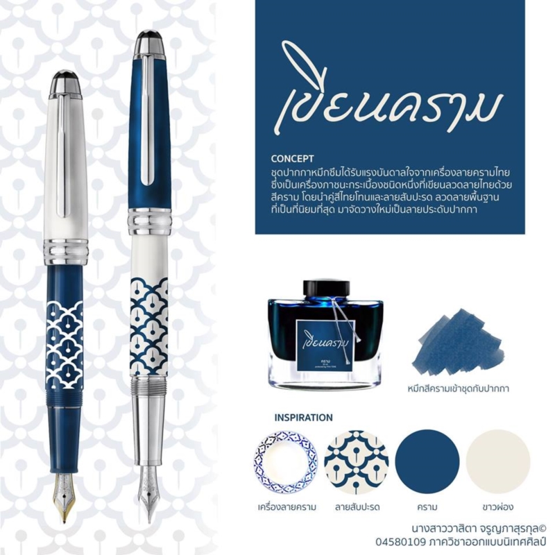 เขียนคราม ปากกาหมึกซึม ลวดลายแบบเครื่องลายคราม และลายสับปะรด ผลงานของ วาสิตา จรูญภาสุรกุล