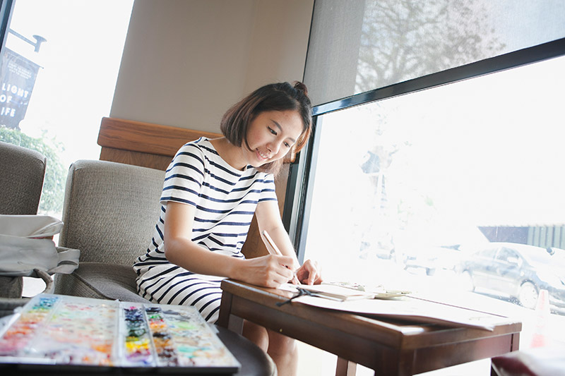 “ทุกวันนี้ไลฟ์สไตล์กับงานแทบจะแยกกันไม่ออก สำหรับเรามันดีนะ อย่างตื่นมาตอนเช้าจะดูหนังก่อนเลย ขึ้นอยู่กับว่าวันนี้อยากได้อารมณ์ความอยากวาดแบบไหน หนังแรงบันดาลใจ หนังรัก หรือการ์ตูน ดูจนมันอิ่มที่เราจะมีแรงบันดาลใจถึงจะเริ่มวาดรูป และจะวาดจนไม่อยากวาดอีก บางรูปไม่จบในวันเดียว วาดตา วาดผมไว้ อยากโฟกัสตรงนั้นให้ดีที่สุด การวาดคือการใช้พลังทั้งหมดมาจากข้างใน วันไหนพลังหมด ก็จะวาดไม่ได้เลย”