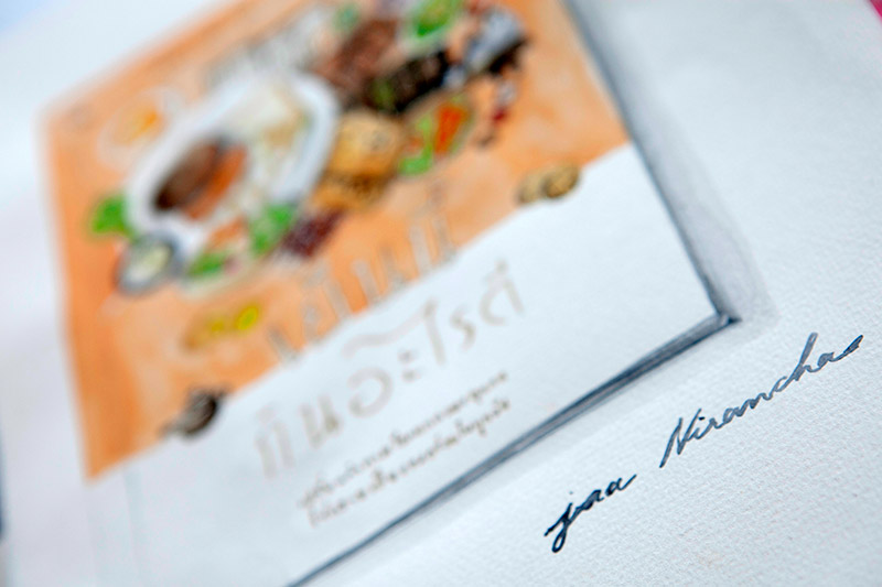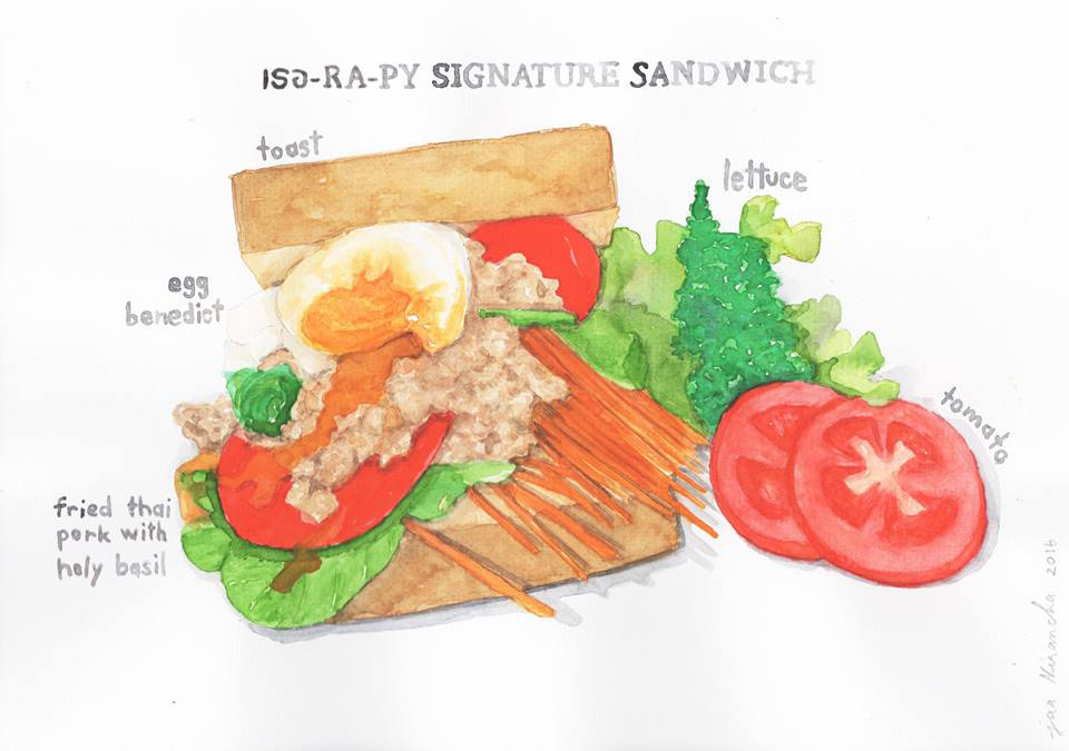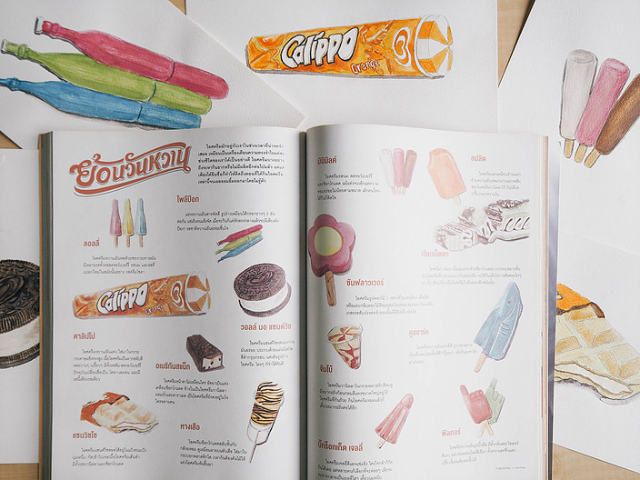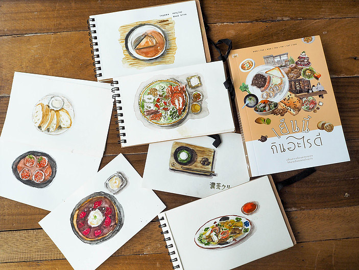 “ตอนนี้ทำทั้งวาดภาพประกอบ ถ่ายภาพ ทำกราฟิก แล้วก็เวิร์คช้อป คนจ้างก็จะรู้สึกเราทำได้หมด มันดูวุ่นวาย แต่ดีนะ มันเป็นวงกลมที่ดูเป็นเรื่องเดียวกัน อย่าง “เย็นนี้ กินอะไรดี” ก็เริ่มมาจากทางบก.อยากได้แนวเกี่ยวกับอาหาร แล้วเราก็ชอบวาดรูปอาหาร ส่วนกานต์ (นักเขียน) ก็ชอบชิมอาหาร ก็เลยได้ลิสต์ร้าน แล้วนัดกันไปทำ คือไปนั่งวาดรูปที่ร้านเลย ถ้าได้วาดกับของจริงมันจะอินกว่า มันได้อารมณ์ของมัน บางร้านวาดเร็วมาก เพราะมันมีร้านข้างทางด้วย บางทีก็วาดลงในทิชชู่ด้วย เพราะแต่ละร้านเนื้อทิชชู่ไม่เหมือนกัน บางทิชชู่มีตราของร้าน วาดเสร็จก็เอารูปนั้นมาถ่ายประกอบกับรูปจริง เราอยากให้เล่มนี้ไม่เหมือนเล่มอื่นๆ”