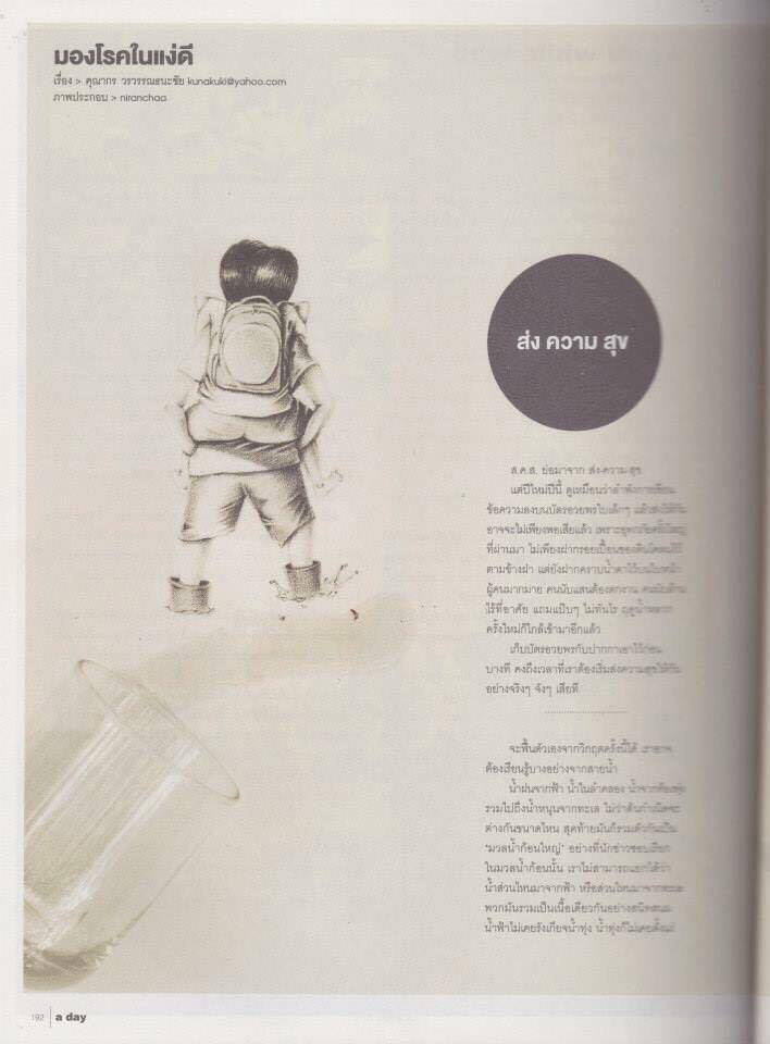 พอเรียนจบมา ไปทำงานที่แรกเป็นงานประจำ อยากรู้จักความคิดของคน แต่คิดว่าเรายังไม่เก่งกราฟิก เลยไปเป็นเลขากองบรรณาธิการที่อะเดย์ก่อน แต่พี่ๆ มาเห็นว่าเราวาดรูปได้ เลยให้ลองงานแรกเป็นวาดรูปประกอบคอลัมน์ “มองโรคในแง่ดี” ก็ทำอยู่ปีหนึ่ง ออกมาทำประจำอีกหลายอย่าง แต่เป็นคนที่ไม่ค่อยชอบงานประจำอยู่แล้ว เพราะบางที่ทำเสร็จเร็วแล้วไม่มีอะไรทำ เราก็ต้องมานั่งรอเวลาให้เลิกงาน ก็รู้สึกเสียดายเวลา จนเริ่มคิดว่าเราพอมีคอนเนกชั่นได้อยู่ เมื่อปีที่แล้ว ตัดสินใจออกมาทำงานอิสระ ปฎิญาณตนว่า ชั้นจะไม่กลับไปทำงานประจำอีกแล้ว จะต้องอยู่ให้ได้”