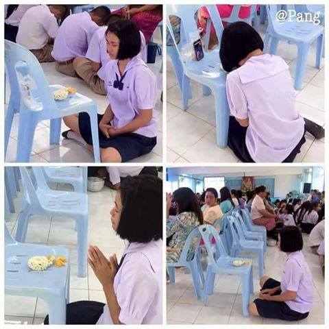ภาพต่อไปนี้จะเป็นภาพที่ทำให้หลายๆ คนตระหนักกับประโยคที่ว่า ทำดีต่อกันเข้าไว้เมื่อตอนที่ยังมีชีวิตอยู่ เพราะหากเมื่อวันใดวันนึงที่ต้องเสียคนที่รักไป จะได้ไม่ต้องมานั่งรู้สึกเสียดายในภายหลังว่ายังไม่ได้ทำอะไรเพื่อเขา และภาพต่อไปนี้เป็นภาพของเด็กนักเรียนหญิงคนหนึ่ง ที่กำลังร่วมกิจกรรมงานโรงเรียนในวันแม่ ด้วยการนำพวงมาลัยมาเพื่อจะกราบแม่ แต่เธอต้องนำไปวางบนเก้าอี้ที่ว่างเปล่า เพราะในวันนี้ไม่มีแม่ของเธอแล้ว