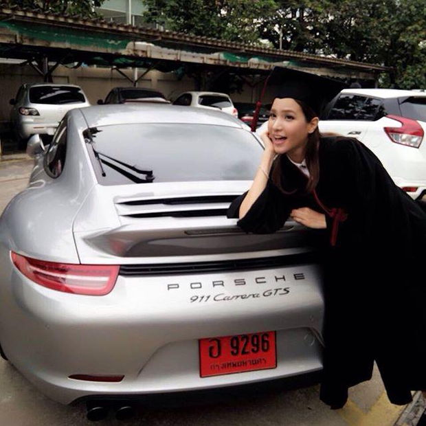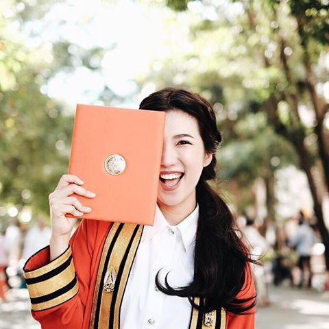 มุก ตอนใส่ชุดครุยรับปริญญ สีแดงสดใส