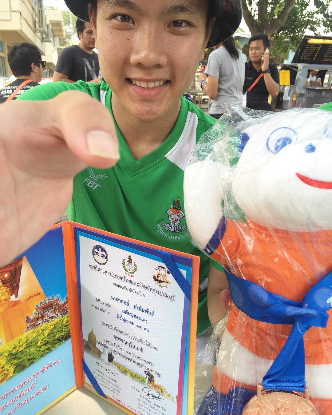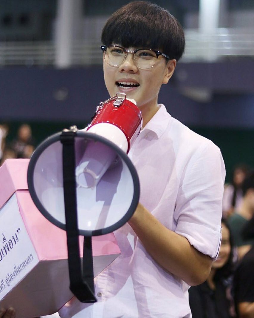 - คนนี้ไง มีน พีรวิชญ์ ตัวแทน มธ. ผู้ถือธงในงานฟุตบอลประเพณีจุฬาฯ-มธ. ครั้งที่ 72