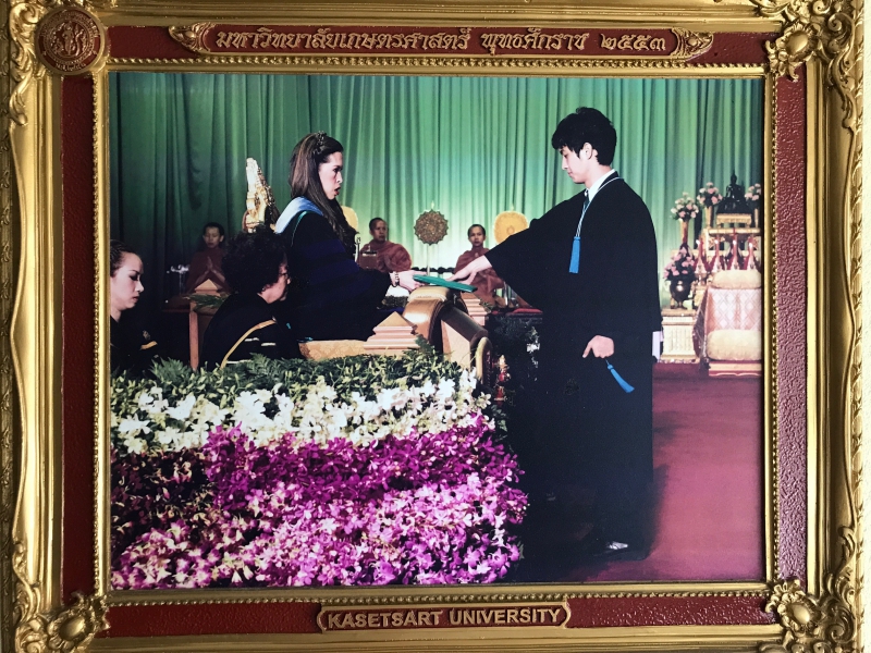 จบจากคณะวิทยาการจัดการ สาขาการจัดการ ม.เกษตรศาสตร์ ด้วยความที่ตอนเลือกมหา’ลัยที่บ้านทำธุรกิจอยู่ แล้วก็ไม่รู้จะเรียนอะไร ก็เรียนไปเผื่อทำงานต่อที่บ้าน ไปปีแรกๆ นี่ไว้ผมยาวเท่าราวนม ทุกคนชอบมาทักว่าเรียนศิลปะหรือเปล่า ไม่เข้ากับบุคลิกเลย แต่พอปี 3 เริ่มตัดผม ก็มีโมเดลลิ่งติดต่อให้ถ่ายโฆษณา เราก็ค้นพบความถนัดของตัวเองว่า ชอบเอนเตอร์เทนท์คน เพื่อนก็อยากให้เราไปอยู่ในกลุ่ม วิชาความรู้ไม่ค่อยมี อาศัยเฝ้าโน้ตบุ๊คได้ ไปซื้อกับข้าวได้ เอามันไปพรีเซ้นท์งาน (ฮา)