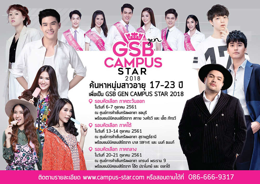 3ภาค !!! มาเกือบครึ่งทางแล้ว สำหรับการเปิดรับสมัครดาวดวงใหม่!!! หนุ่มสาว อายุ 17-23 ปี ในการประกวด “GSB GEN CAMPUS STAR 2018” ที่งานนี้ ธนาคารออมสิน และ นิตยสาร CAMPUS STAR (แคมปัส สตาร์) ในเครือ โมโน กรุ๊ป ผู้จัดงาน ได้จัดศิลปินไปร่วมให้กำลังใจผู้เข้าประกวดทั้ง 3 ภาค ตลอดเดือนตุลาคม 2561