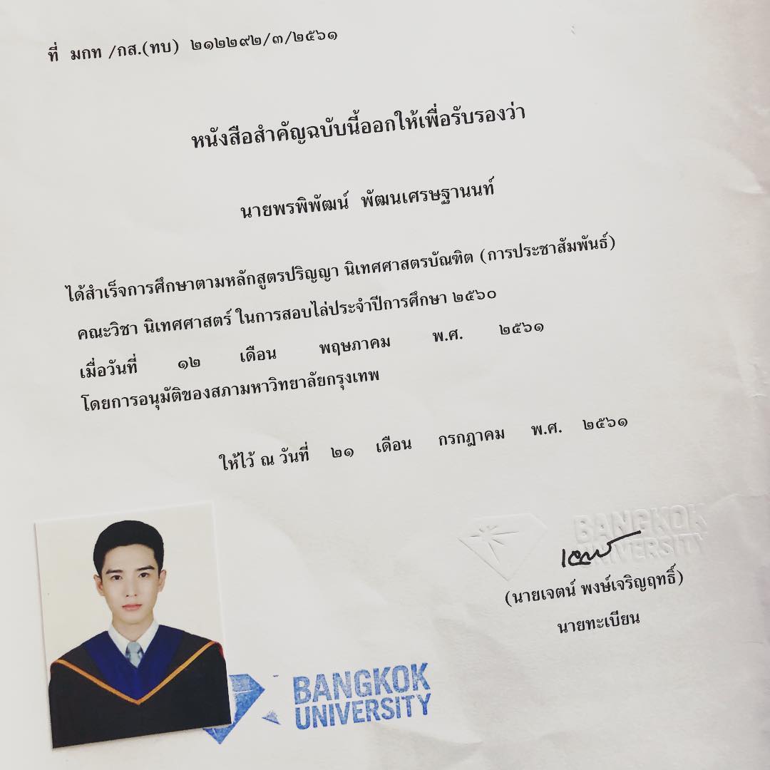 นอกจาก หนุ่มพลัสเตอร์ จะทุ่มเวลาให้กับการทำงานในวงการบันเทิงแล้ว ในเรื่องของการเรียนนั้นหนุ่มคนนี้เขาก็ขยัน ทุ่มเท ไม่แพ้กันเลย โดยล่าสุด! หนุ่มพลัสเตอร์ ได้ขึ้นแท่นเป็นบัณฑิตใหม่ป้ายแดงจากคณะนิเทศศาสตร์ เอกการประชาสัมพันธ์ มหาวิทยาลัยกรุงเทพ เป็นที่เรียบร้อยแล้ว โดยเขาจะเข้าพิธีประสาทปริญญาบัตรจริงในช่วงเดือนมีนาคม 2562 แคมปัส-สตาร์ ขอแสดงความยินดีกับหนุ่มพลัสเตอร์ด้วยนะจ๊ะ