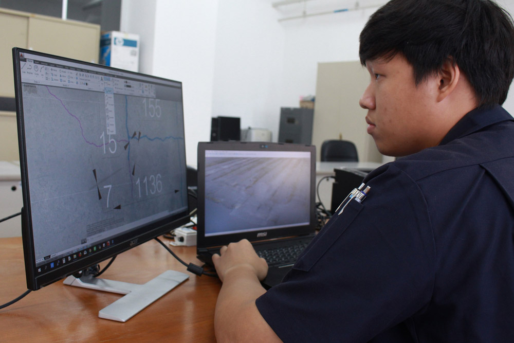 โดยนำโดรนมาช่วยสำรวจสิ่งปลูกสร้างต่างๆ ที่ทำจากคอนกรีต ได้แก่ เขื่อน สะพาน ทางด่วน ที่มีความจำเป็นต้องใช้ความรู้ทางวิศวกรรรมโยธา สำรวจความแข็งแรงของโครงสร้าง รอยร้าว การเอียง และการทรุด โดยนำภาพที่ได้จากการถ่ายภาพของโดรน มาประมวลผลด้วยโปรแกรมคอมพิวเตอร์ (Visual Inspection) เพื่อสร้างแบบจำลอง 3 มิติ และนำเทคโนโลยีปัญญาประดิษฐ์ หรือ AI มาช่วยตรวจจับความผิดปกติของโครงสร้าง แสดงผลเป็นเส้นสีเหลือง และสร้างแผนที่ความเสียหายได้อัตโนมัติ ซึ่งวิศวกรสามารถนำแบบจำลองที่ได้ ไปตรวจสอบประเมินความเสี่ยงและหาแนวทางปรับปรุงซ่อมแซมต่อไป
