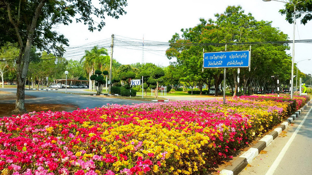 ช่วงเดือนกุมภาพันธ์ถึงเมษายนในทุกๆ ปี ต้องบอกว่า ที่ “มหาวิทยาลัยเกษตรศาสตร์ วิทยาเขตกำแพงแสน” นี้น่าไปถ่ายรูปที่สุด เพราะทั้งชื่อเสียงที่โด่งดังของ “ชมพูพันธุ์ทิพย์” ที่ผลิดอกบานสะพรั่งแล้ว ยังมีเหลืองปรีดียาธร สีเหลืองอร่าม จนถึง ต้นตะแบก ลีลาวดี รวมถึงเฟื่องฟ้า เรียกว่าไปมุมไหนก็ถ่ายรูปกันเพลินมาก